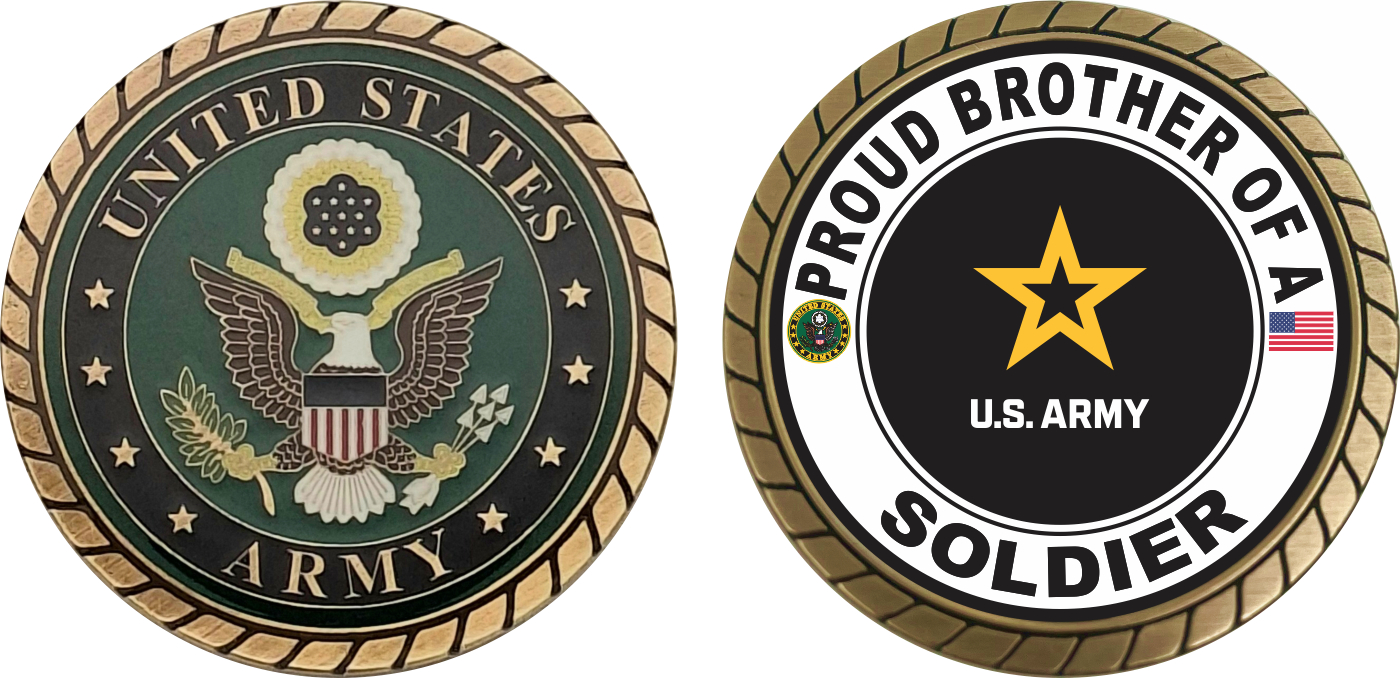 This 1 3/4” Proud Brother of a Soldier U.S. Army Challenge Coin is proudly offered by MilitaryBest. This Officially Licensed Army coin has beautiful enamel finish on one side and an organized crisp clean Proud Brother of a Soldier U.S. Army design on the opposite side.