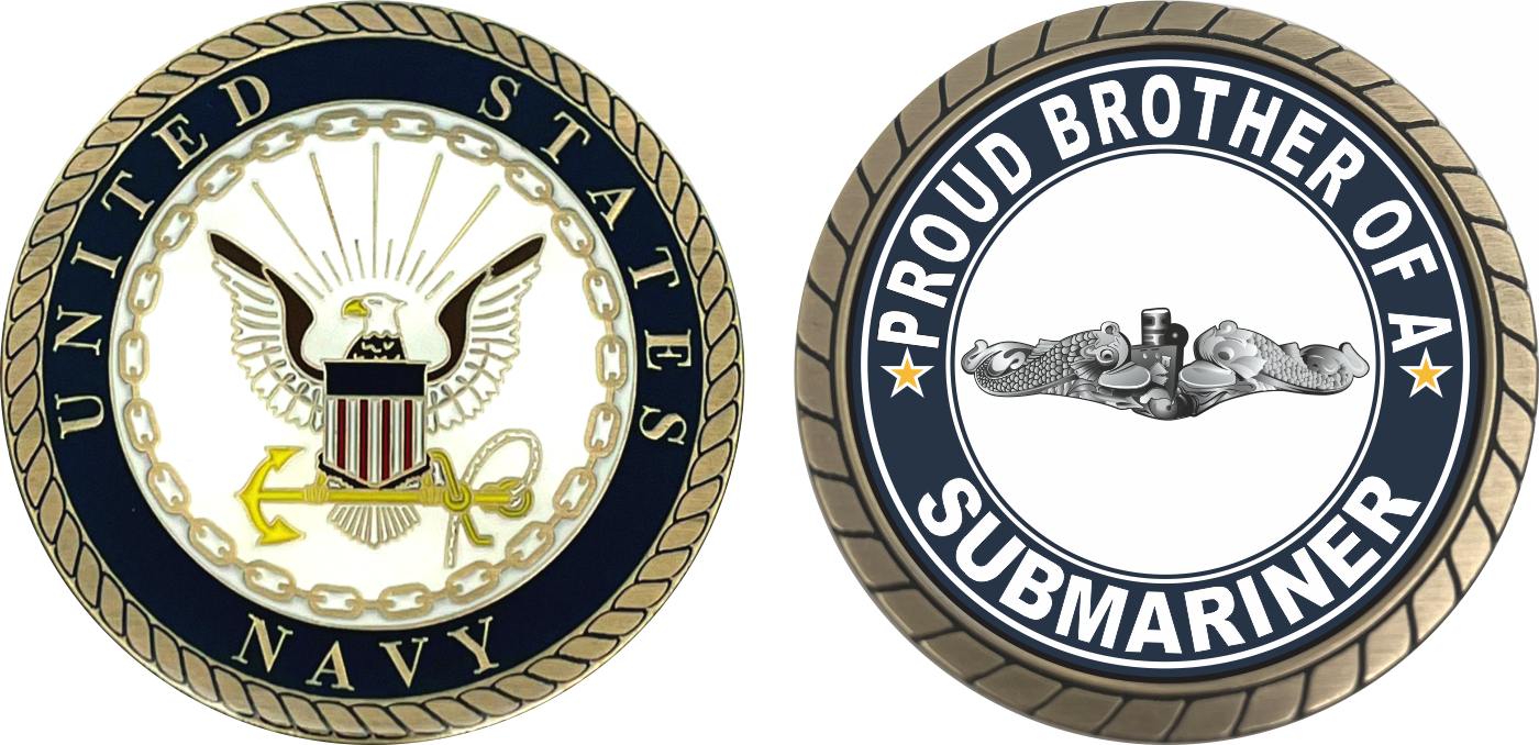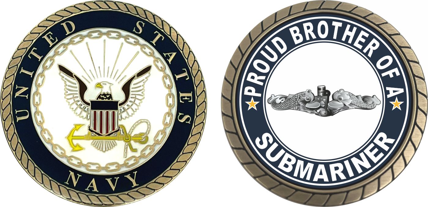This 1 3/4” Proud Brother of a Submariner Silver Dolphins Challenge Coin is proudly offered by MilitaryBest. This Officially Licensed Navy coin has beautiful enamel finish on one side and an organized crisp clean Proud Brother of a Submariner design on the opposite side.