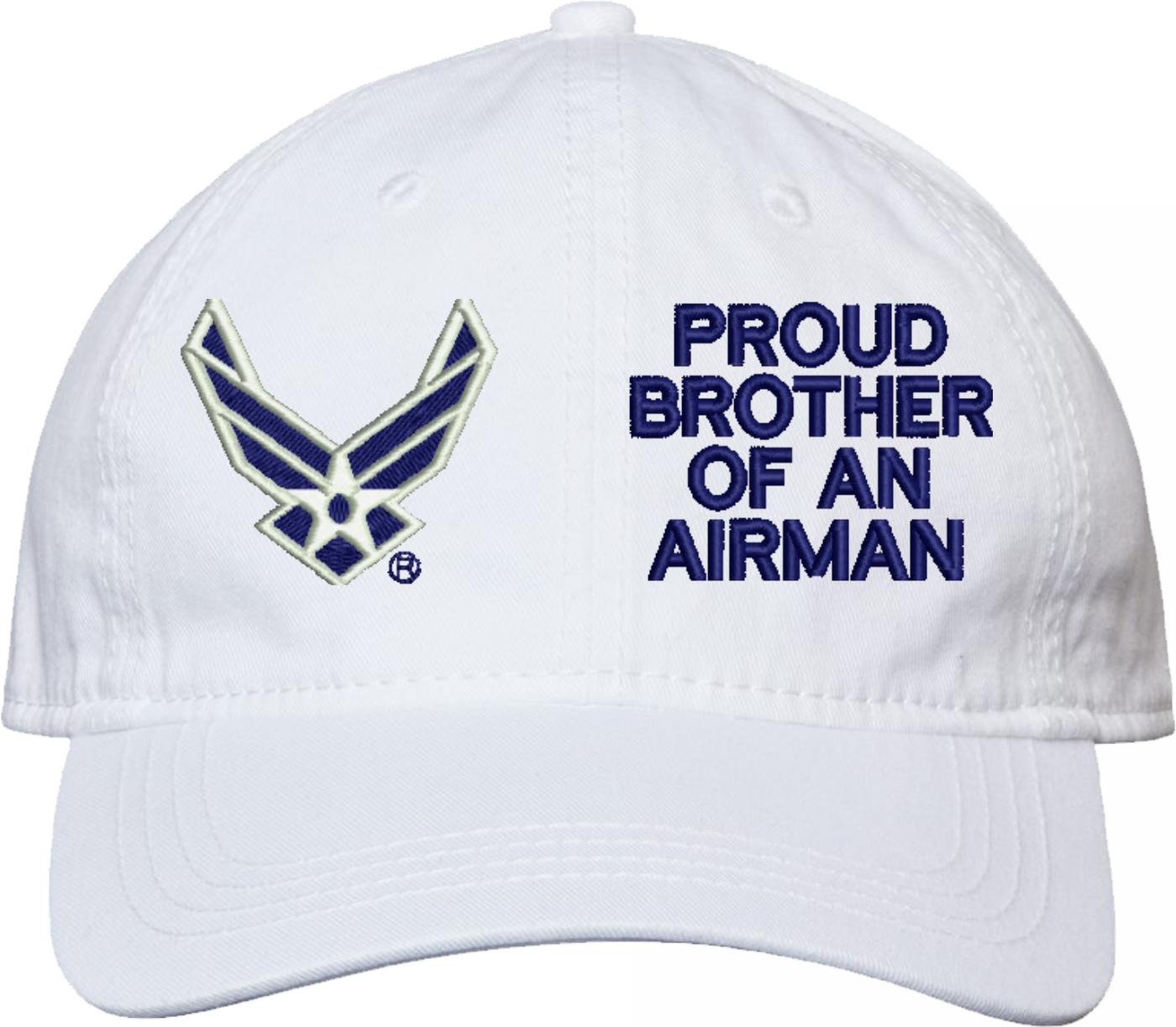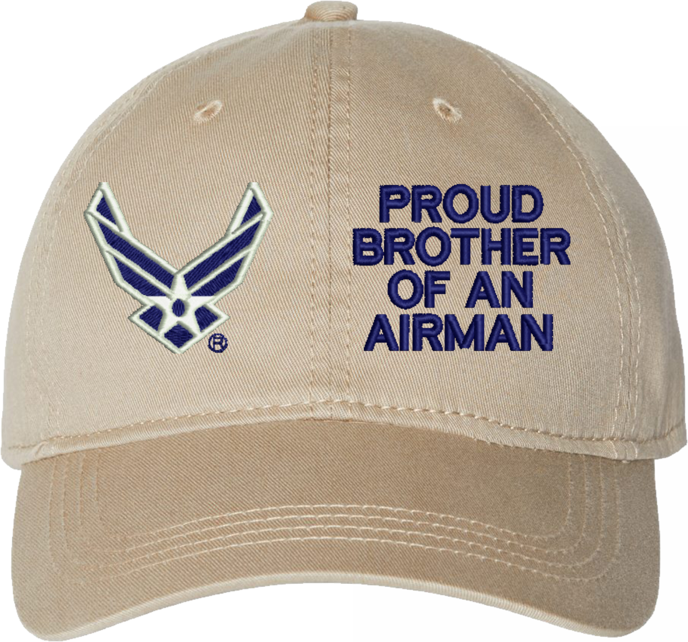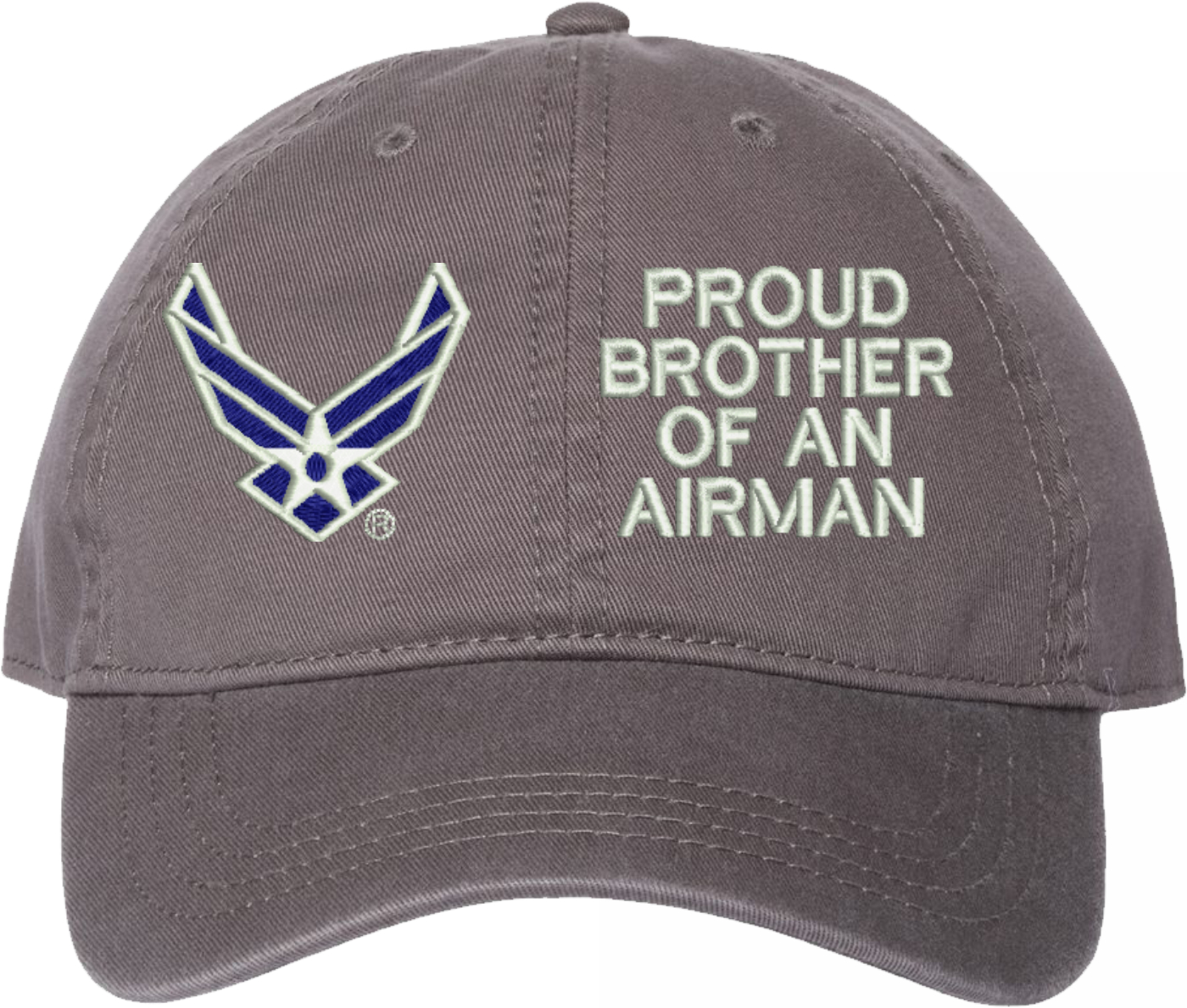 Show your Air Force pride with this Proud Brother of an Airman U.S. Air Force Unstructured Dad Cap from MilitaryBest. Crafted from 100% washed chino twill cotton, this six-panel, low-profile cap offers a relaxed and comfortable fit. Featuring high-quality embroidery done in our Scottsboro, Alabama facility, this cap is designed with a pre-curved visor and an adjustable tri-glide buckle closure for a perfect fit. Whether for everyday wear or as a meaningful gift, this cap is a great way to honor your own or a loved one's service.For caps ordered with custom embroidered personalized text please allow an additional 3 to 5 days production time. All custom back text will be embroidered in ALL CAPITAL LETTERS. Caps with back text or eggs are non-returnable unless there is a material defect in the cap.