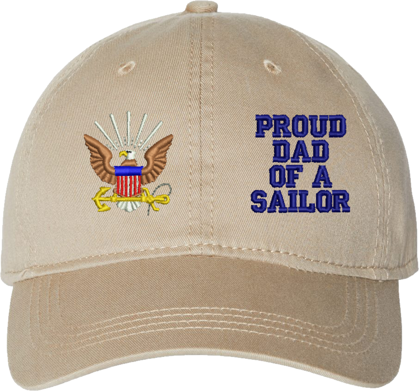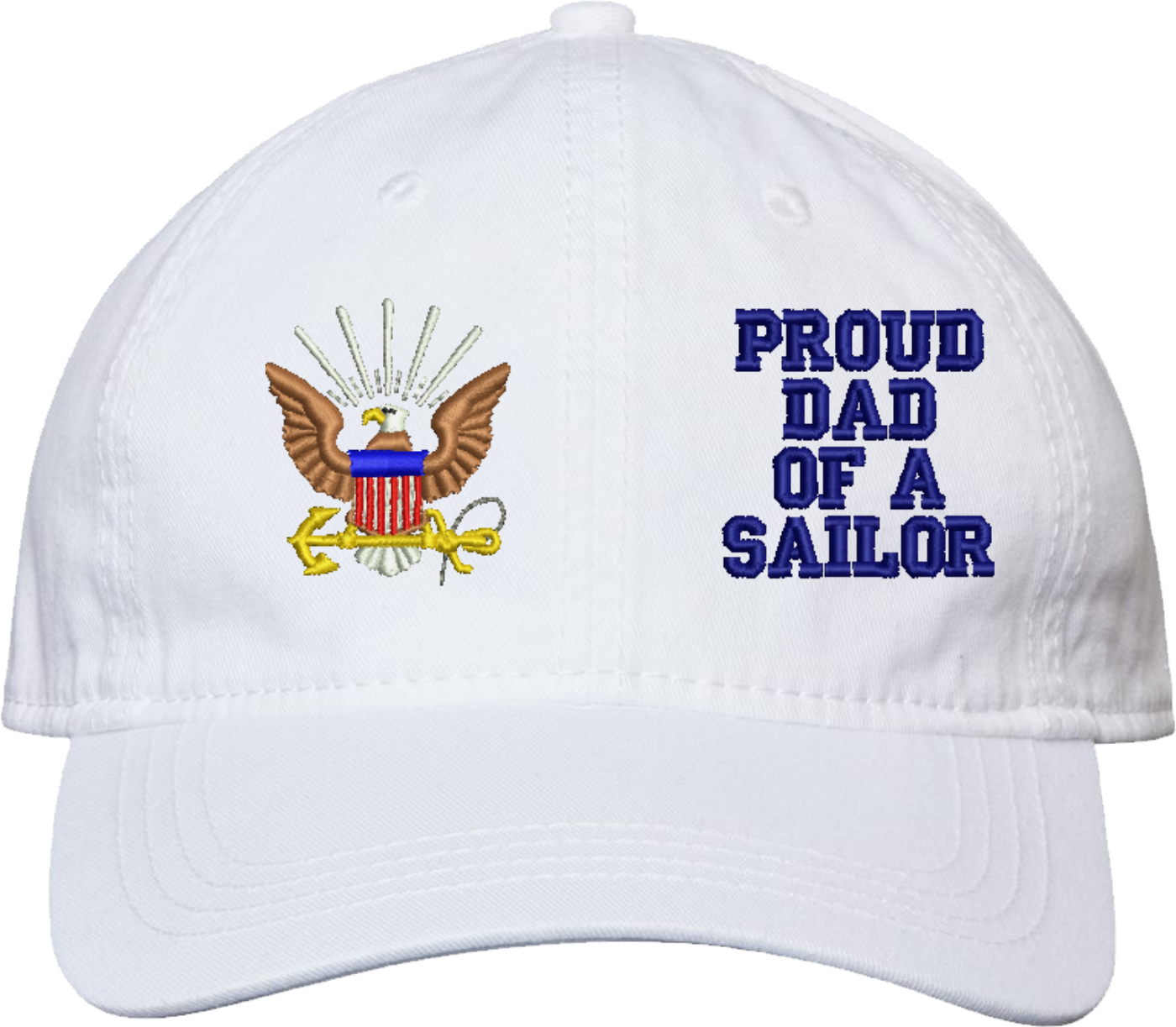 Show your Navy pride with this Proud Dad of a Sailor U.S. Navy Unstructured Dad Cap from MilitaryBest. Crafted from 100% washed chino twill cotton, this six-panel, low-profile cap offers a relaxed and comfortable fit. Featuring high-quality embroidery done in our Scottsboro, Alabama facility, this cap is designed with a pre-curved visor and an adjustable tri-glide buckle closure for a perfect fit. Whether for everyday wear or as a meaningful gift, this cap is a great way to honor your own or a loved one's service.For caps ordered with custom embroidered personalized text please allow an additional 3 to 5 days production time. All custom back text will be embroidered in ALL CAPITAL LETTERS. Caps with back text or eggs are non-returnable unless there is a material defect in the cap.