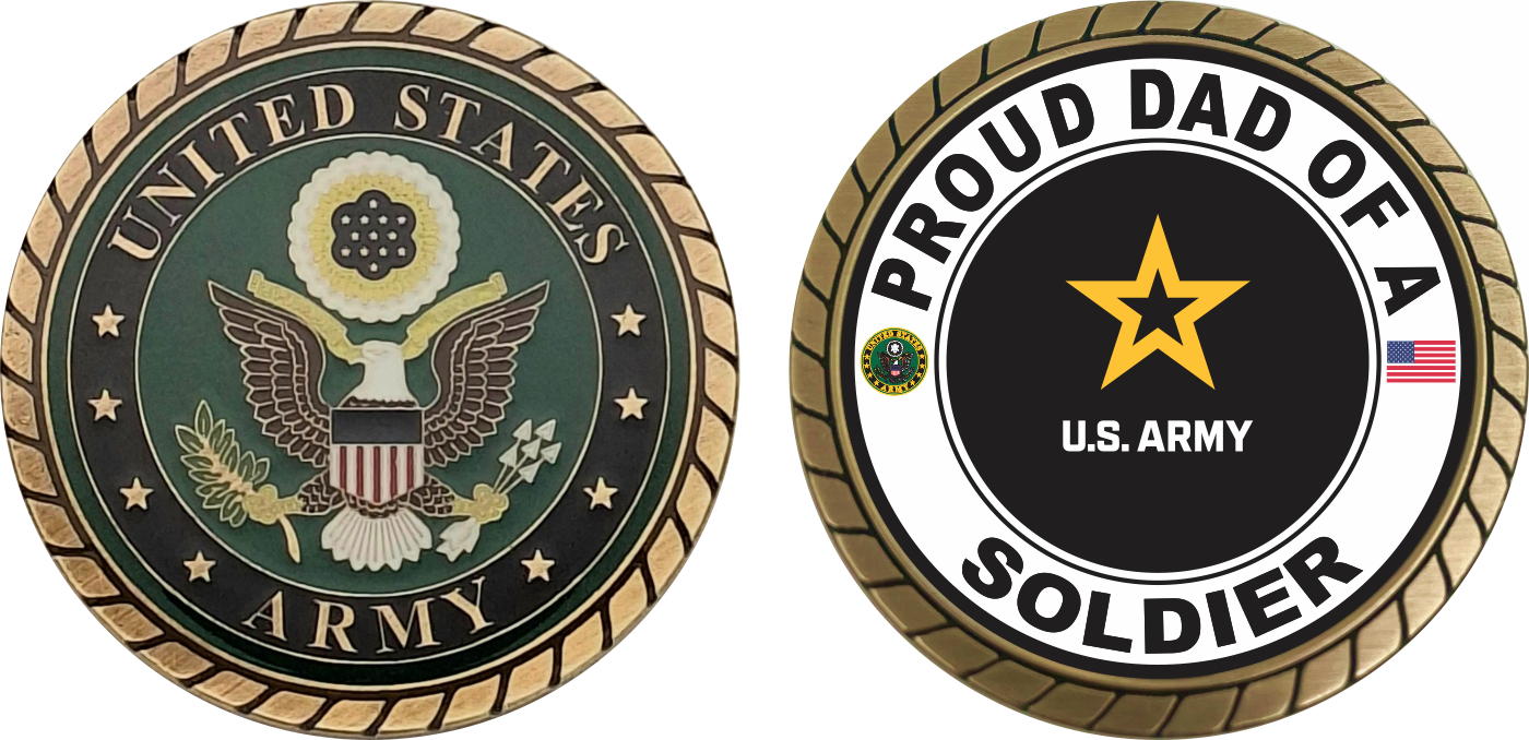 This 1 3/4” Proud Dad of a Soldier U.S. Army Challenge Coin is proudly offered by MilitaryBest. This Officially Licensed Army coin has beautiful enamel finish on one side and an organized crisp clean Proud Dad of a Soldier U.S. Army design on the opposite side.