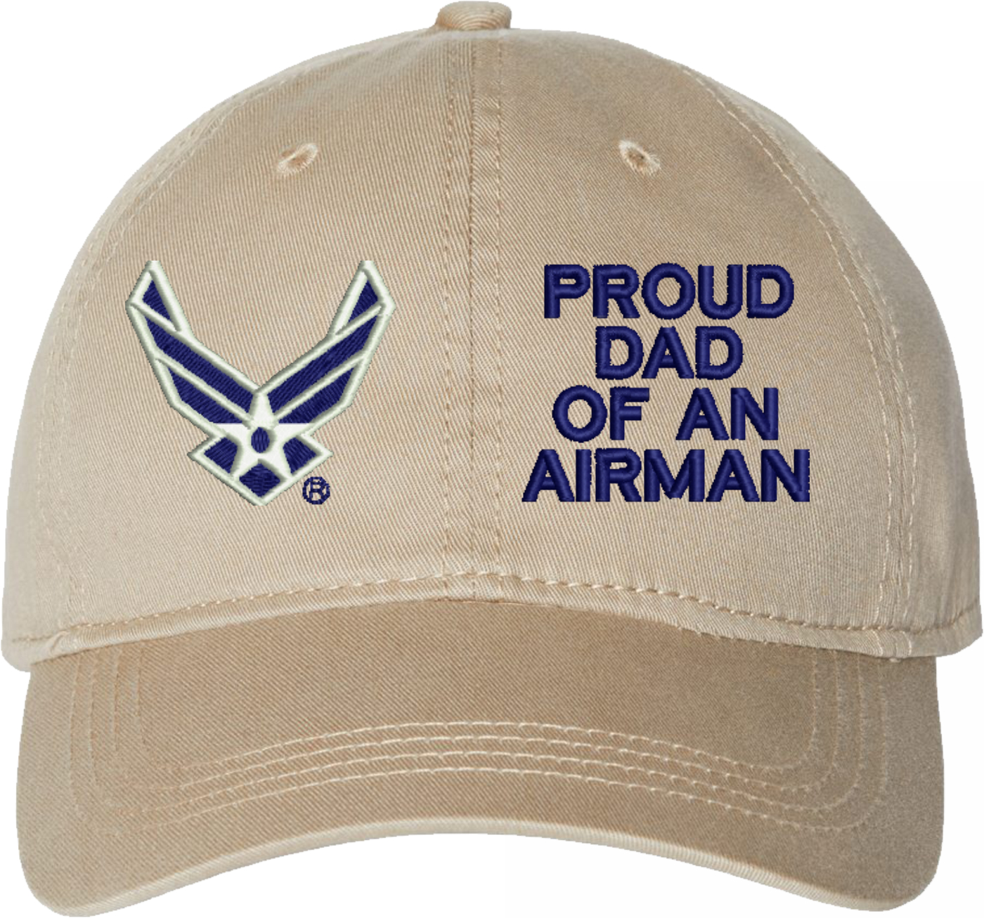 Show your Air Force pride with this Proud Dad of an Airman U.S. Air Force Unstructured Dad Cap from MilitaryBest. Crafted from 100% washed chino twill cotton, this six-panel, low-profile cap offers a relaxed and comfortable fit. Featuring high-quality embroidery done in our Scottsboro, Alabama facility, this cap is designed with a pre-curved visor and an adjustable tri-glide buckle closure for a perfect fit. Whether for everyday wear or as a meaningful gift, this cap is a great way to honor your own or a loved one's service.For caps ordered with custom embroidered personalized text please allow an additional 3 to 5 days production time. All custom back text will be embroidered in ALL CAPITAL LETTERS. Caps with back text or eggs are non-returnable unless there is a material defect in the cap.