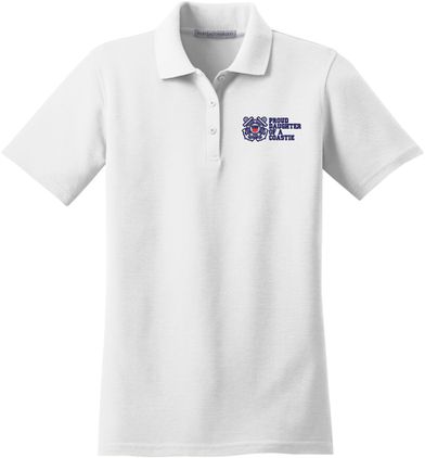 MilitaryBest is proud to offer this Proud Daughter of a Coastie U.S. Coast Guard Women's Stain-Release Polo. This polo is embroidered by our MilitaryBest team in Northeast Alabama. These polos are made with a stain-release finish for long-lasting wear, odor-fighting properties, and superior wrinkle and shrink resistance.Care Instructions: Machine Wash Cold With Like Colors. Do Not Use Fabric Softener. Do Not Bleach. Tumble Dry Low. Warm Iron If Necessary.