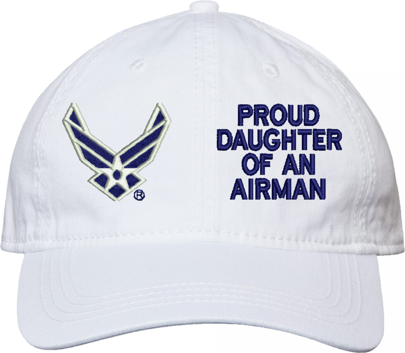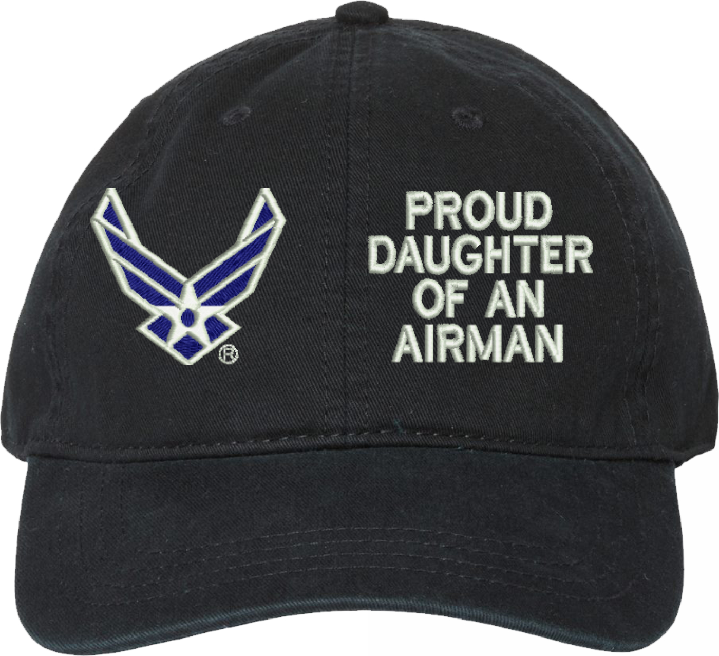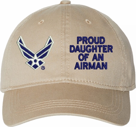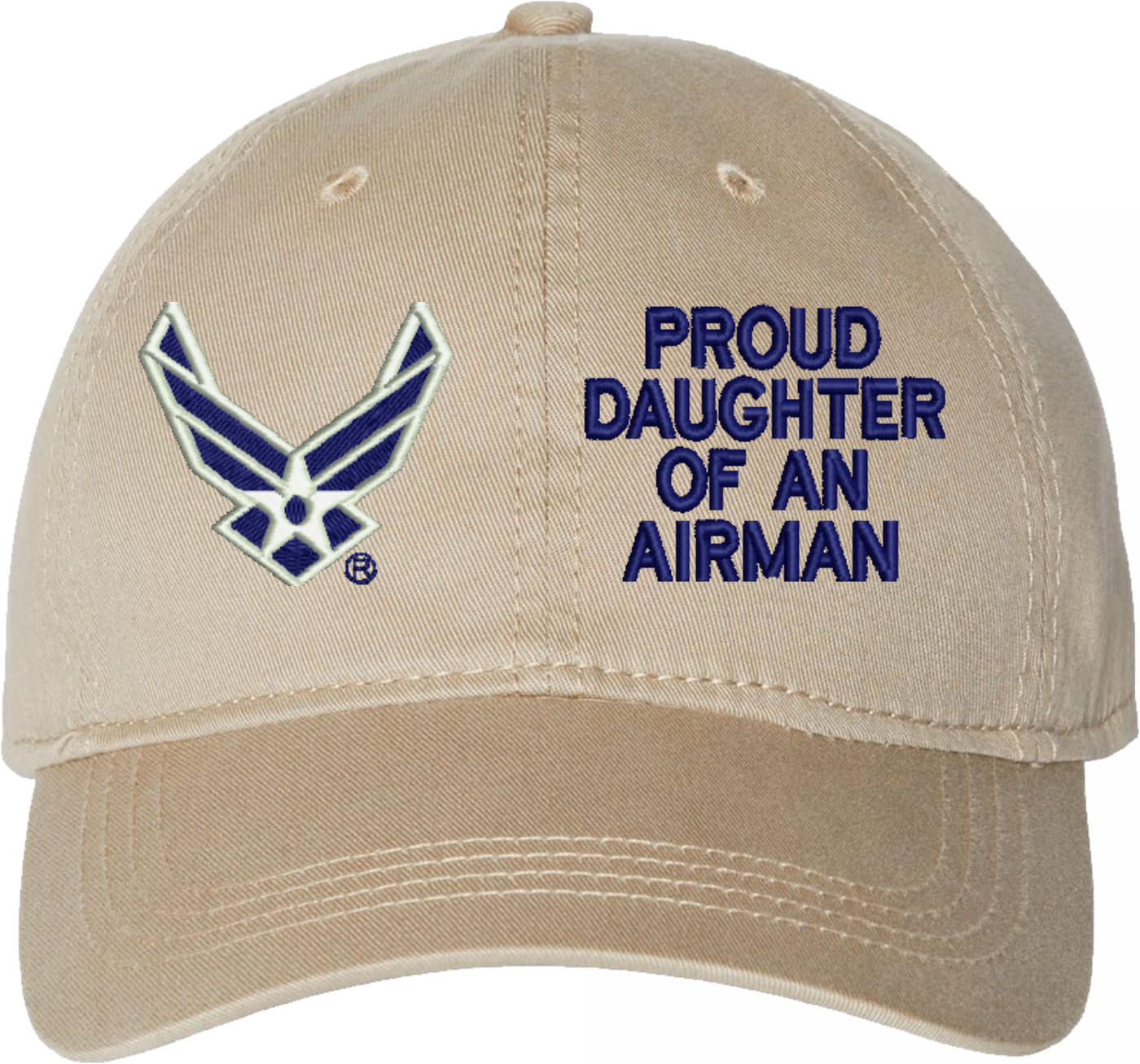 Show your Air Force pride with this Proud Daughter of an Airman U.S. Air Force Unstructured Dad Cap from MilitaryBest. Crafted from 100% washed chino twill cotton, this six-panel, low-profile cap offers a relaxed and comfortable fit. Featuring high-quality embroidery done in our Scottsboro, Alabama facility, this cap is designed with a pre-curved visor and an adjustable tri-glide buckle closure for a perfect fit. Whether for everyday wear or as a meaningful gift, this cap is a great way to honor your own or a loved one's service.For caps ordered with custom embroidered personalized text please allow an additional 3 to 5 days production time. All custom back text will be embroidered in ALL CAPITAL LETTERS. Caps with back text or eggs are non-returnable unless there is a material defect in the cap.