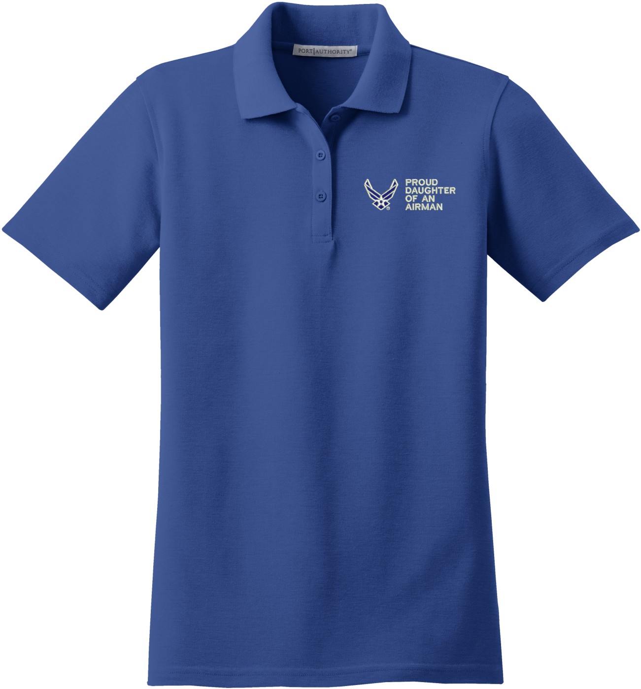 MilitaryBest is proud to offer this Proud Daughter of an Airman U.S. Air Force Women's Stain-Release Polo. This polo is embroidered by our MilitaryBest team in Northeast Alabama. These polos are made with a stain-release finish for long-lasting wear, odor-fighting properties, and superior wrinkle and shrink resistance.Care Instructions: Machine Wash Cold With Like Colors. Do Not Use Fabric Softener. Do Not Bleach. Tumble Dry Low. Warm Iron If Necessary.