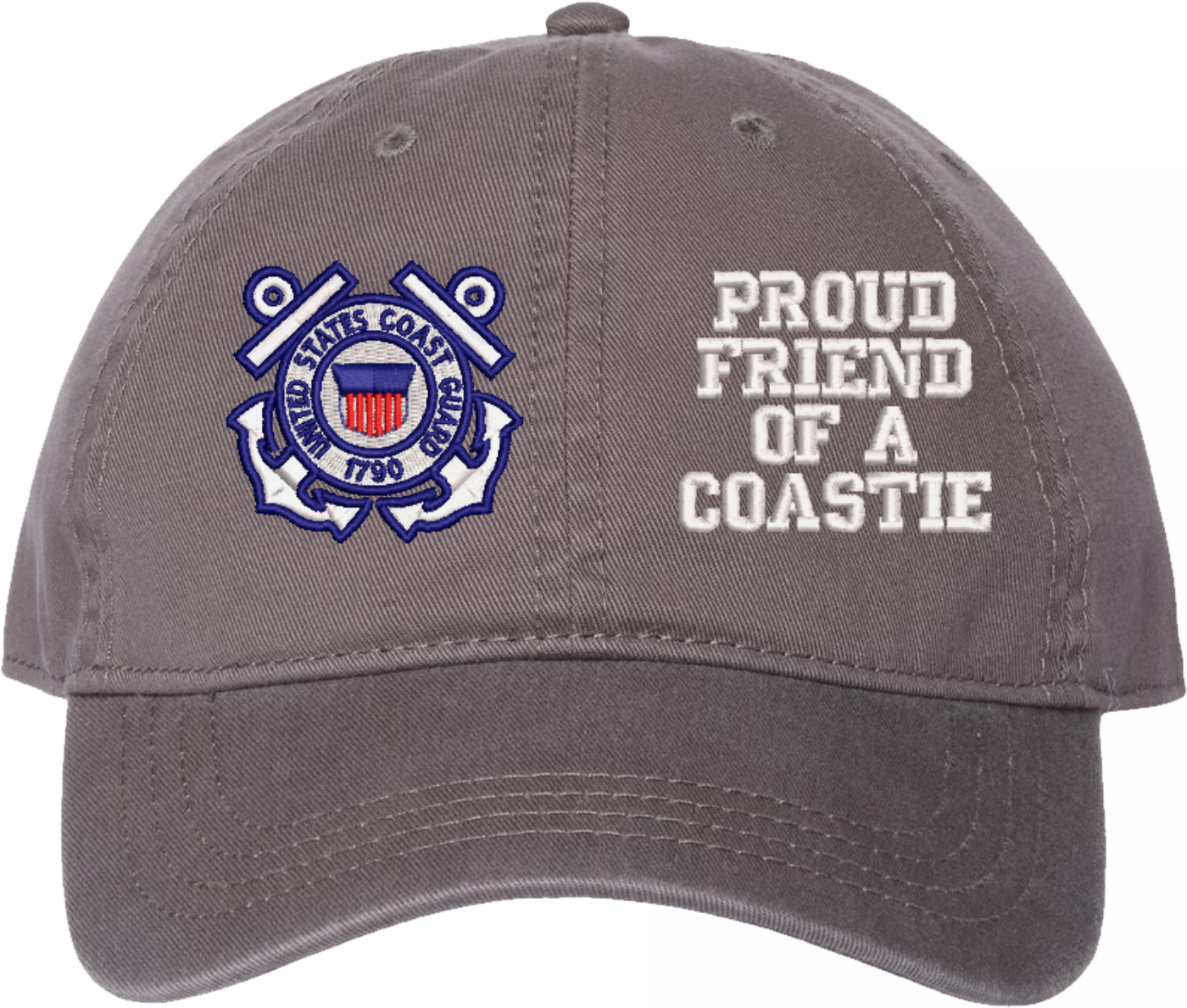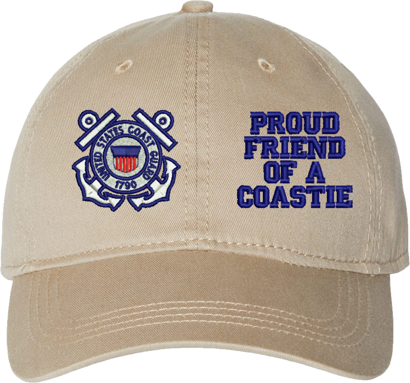 Show your Coast Guard pride with this Proud Friend of a Coastie U.S. Coast Guard Unstructured Dad Cap from MilitaryBest. Crafted from 100% washed chino twill cotton, this six-panel, low-profile cap offers a relaxed and comfortable fit. Featuring high-quality embroidery done in our Scottsboro, Alabama facility, this cap is designed with a pre-curved visor and an adjustable tri-glide buckle closure for a perfect fit. Whether for everyday wear or as a meaningful gift, this cap is a great way to honor your own or a loved one's service.For caps ordered with custom embroidered personalized text please allow an additional 3 to 5 days production time. All custom back text will be embroidered in ALL CAPITAL LETTERS. Caps with back text or eggs are non-returnable unless there is a material defect in the cap.