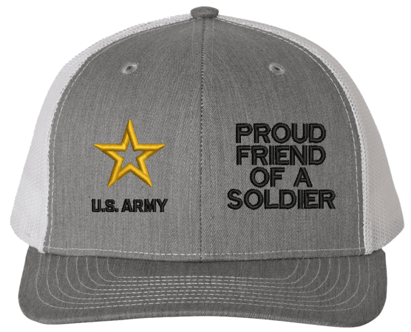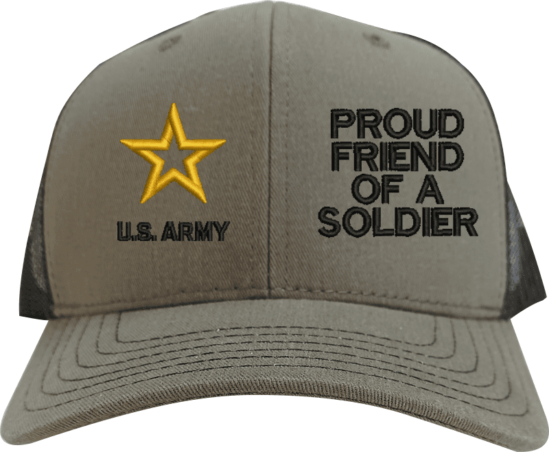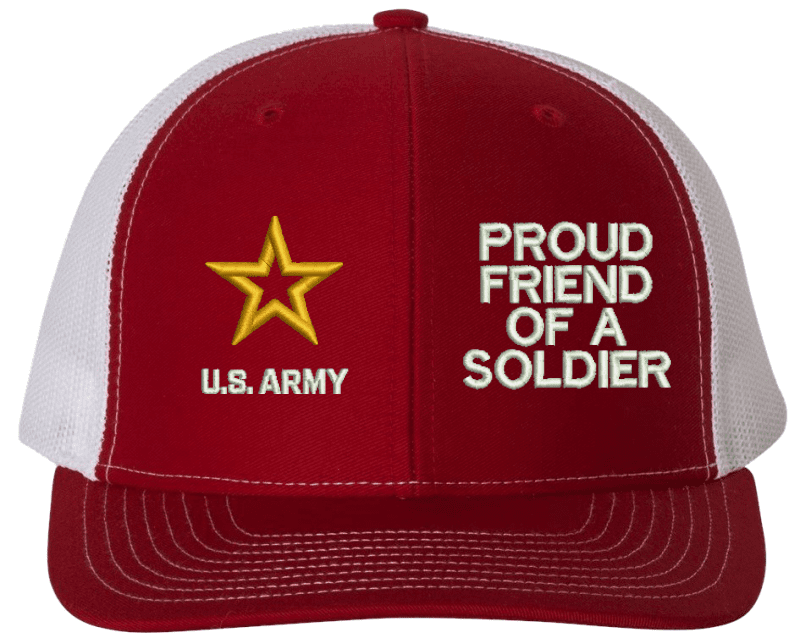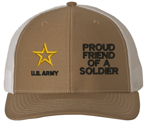 MilitaryBest is proud to offer this Proud Friend of a Soldier U.S. Army Mesh Back Cap. The design of this U.S. Army Cap is crisp, clean, and sure to be loved by people of all ages! Select above from our many cap colors. This Proud Friend of a Soldier U.S. Army Mesh Back Cap is crafted by our skilled embroidery technicians at our facilities in Scottsboro, AL. As with all MilitaryBest items, your satisfaction is guaranteed!Caps ordered with custom embroidered personalized back text require an additional 2 to 3 days production time. All custom back text will be embroidered in ALL CAPITAL LETTERS. Caps personalized with back text are non-returnable unless there is a material defect in the cap.