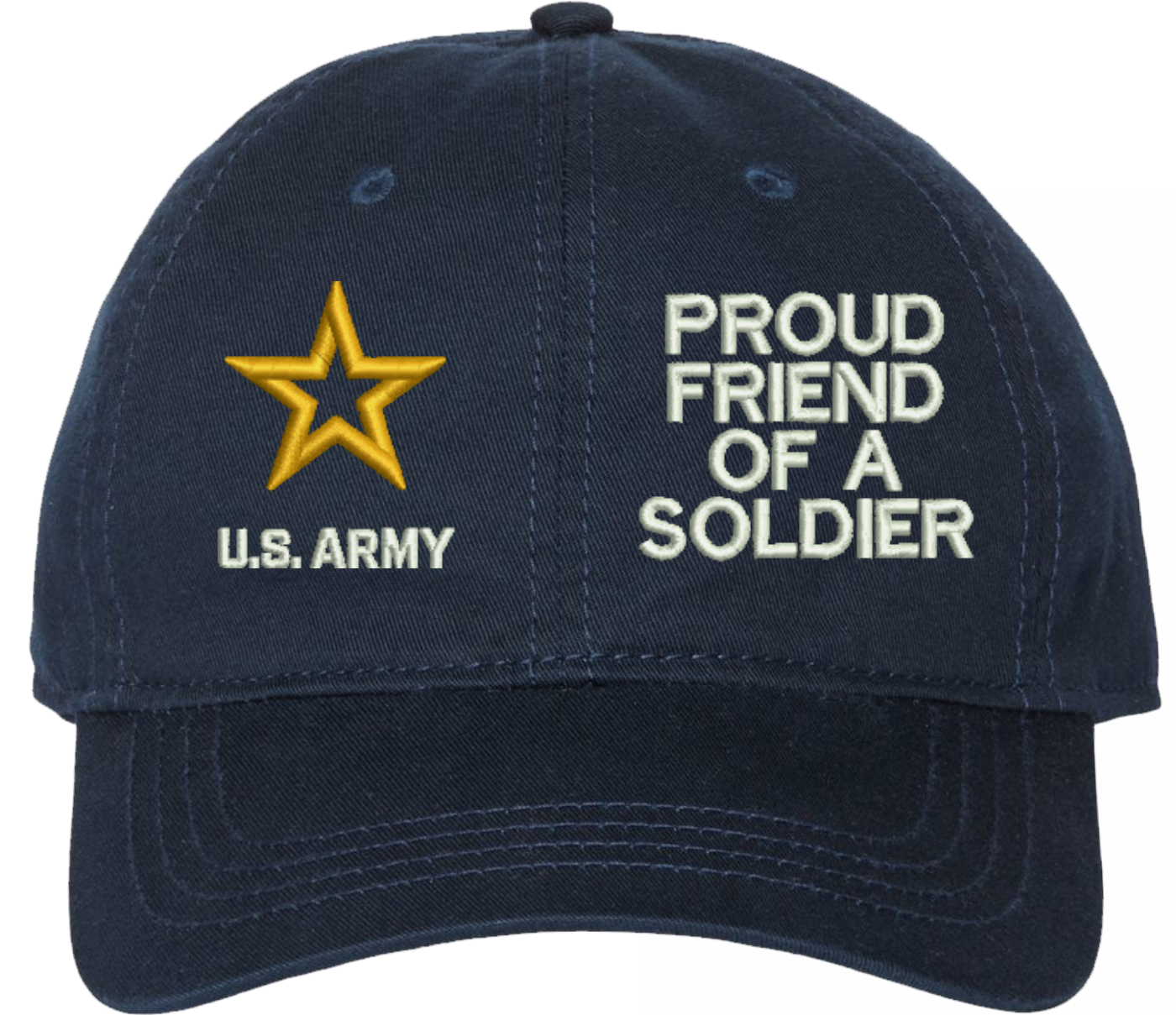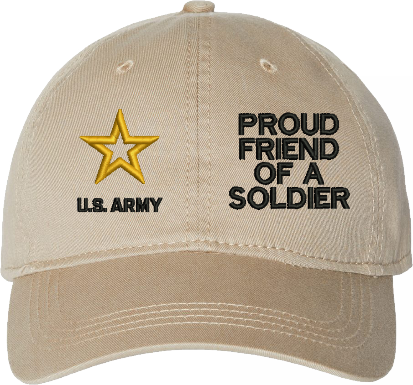 Show your Army pride with this Proud Friend of a Soldier U.S. Army Unstructured Dad Cap from MilitaryBest. Crafted from 100% washed chino twill cotton, this six-panel, low-profile cap offers a relaxed and comfortable fit. Featuring high-quality embroidery done in our Scottsboro, Alabama facility, this cap is designed with a pre-curved visor and an adjustable tri-glide buckle closure for a perfect fit. Whether for everyday wear or as a meaningful gift, this cap is a great way to honor your own or a loved one's service.For caps ordered with custom embroidered personalized text please allow an additional 3 to 5 days production time. All custom back text will be embroidered in ALL CAPITAL LETTERS. Caps with back text or eggs are non-returnable unless there is a material defect in the cap.