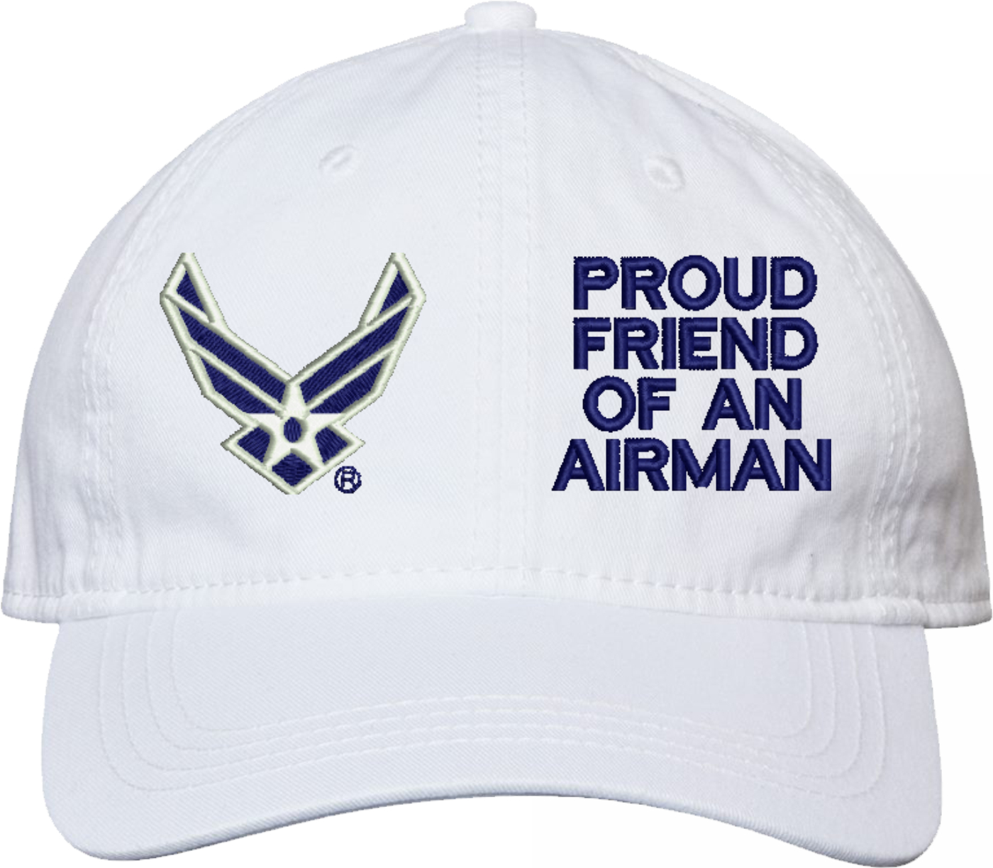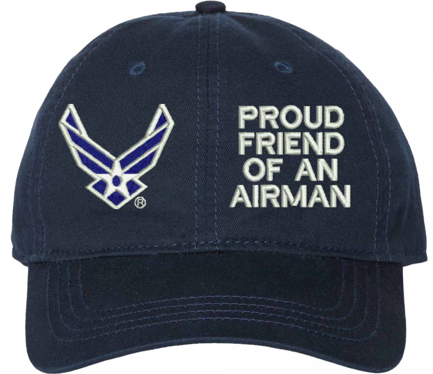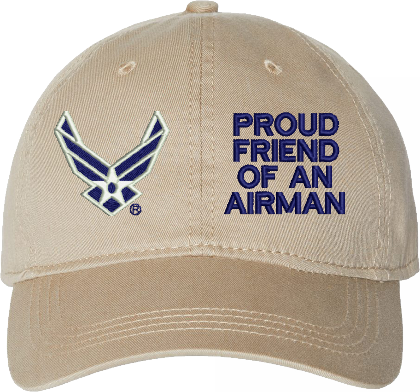Show your Air Force pride with this Proud Friend of an Airman U.S. Air Force Unstructured Dad Cap from MilitaryBest. Crafted from 100% washed chino twill cotton, this six-panel, low-profile cap offers a relaxed and comfortable fit. Featuring high-quality embroidery done in our Scottsboro, Alabama facility, this cap is designed with a pre-curved visor and an adjustable tri-glide buckle closure for a perfect fit. Whether for everyday wear or as a meaningful gift, this cap is a great way to honor your own or a loved one's service.For caps ordered with custom embroidered personalized text please allow an additional 3 to 5 days production time. All custom back text will be embroidered in ALL CAPITAL LETTERS. Caps with back text or eggs are non-returnable unless there is a material defect in the cap.