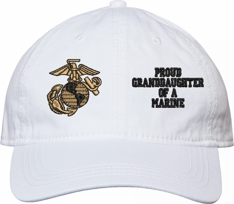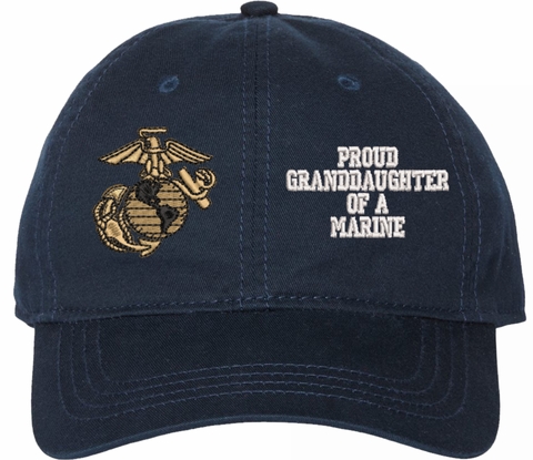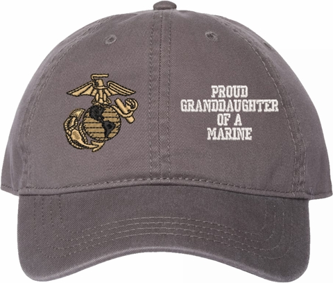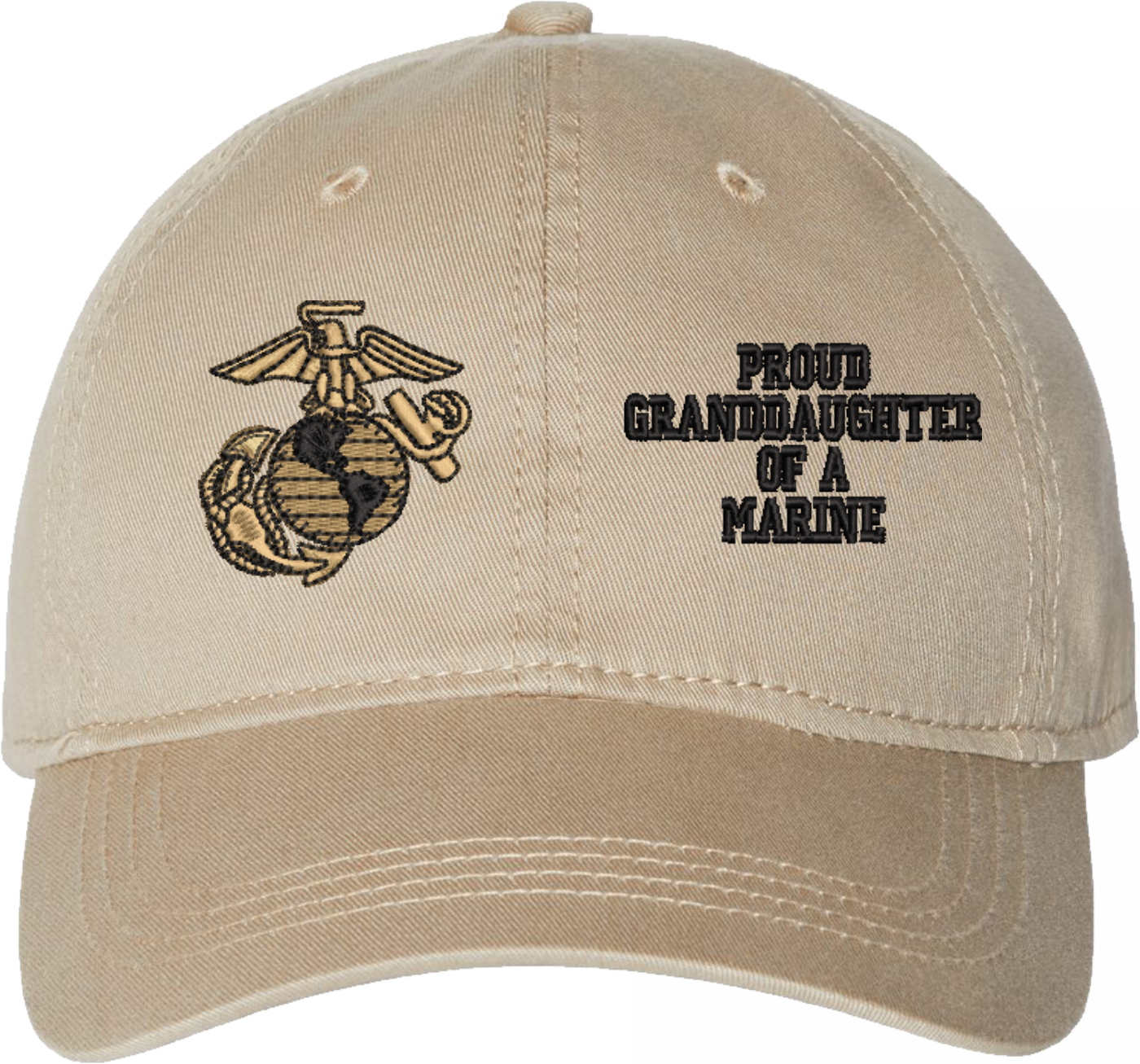 Show your Marine Corps pride with this Proud Grandaughter of a Marine U.S. Marine Corps Unstructured Dad Cap from MilitaryBest. Crafted from 100% washed chino twill cotton, this six-panel, low-profile cap offers a relaxed and comfortable fit. Featuring high-quality embroidery done in our Scottsboro, Alabama facility, this cap is designed with a pre-curved visor and an adjustable tri-glide buckle closure for a perfect fit. Whether for everyday wear or as a meaningful gift, this cap is a great way to honor your own or a loved one's service.For caps ordered with custom embroidered personalized text please allow an additional 3 to 5 days production time. All custom back text will be embroidered in ALL CAPITAL LETTERS. Caps with back text or eggs are non-returnable unless there is a material defect in the cap.
