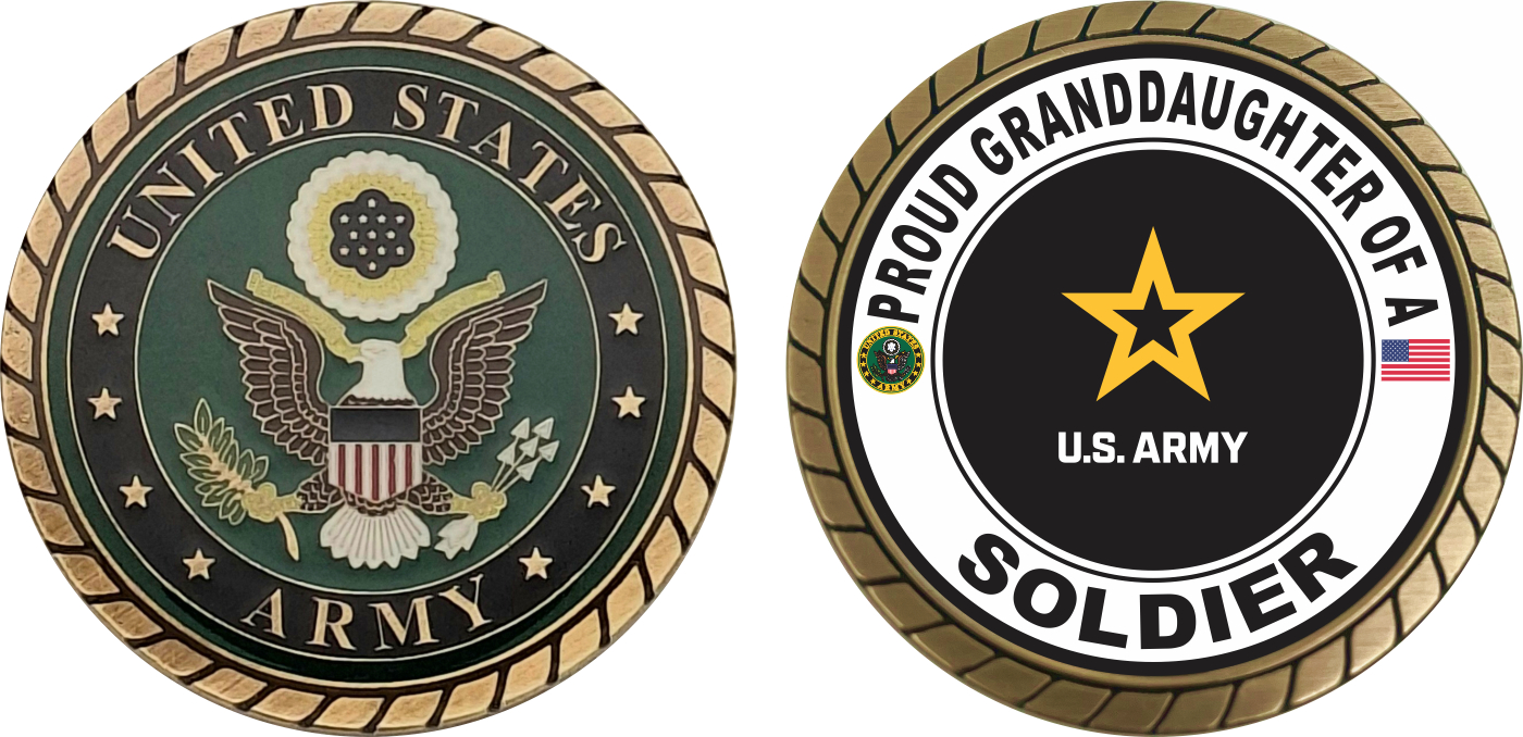 This 1 3/4” Proud Granddaughter of a Soldier U.S. Army Challenge Coin is proudly offered by MilitaryBest. This Officially Licensed Army coin has beautiful enamel finish on one side and an organized crisp clean Proud Granddaughter of a Soldier U.S. Army design on the opposite side.