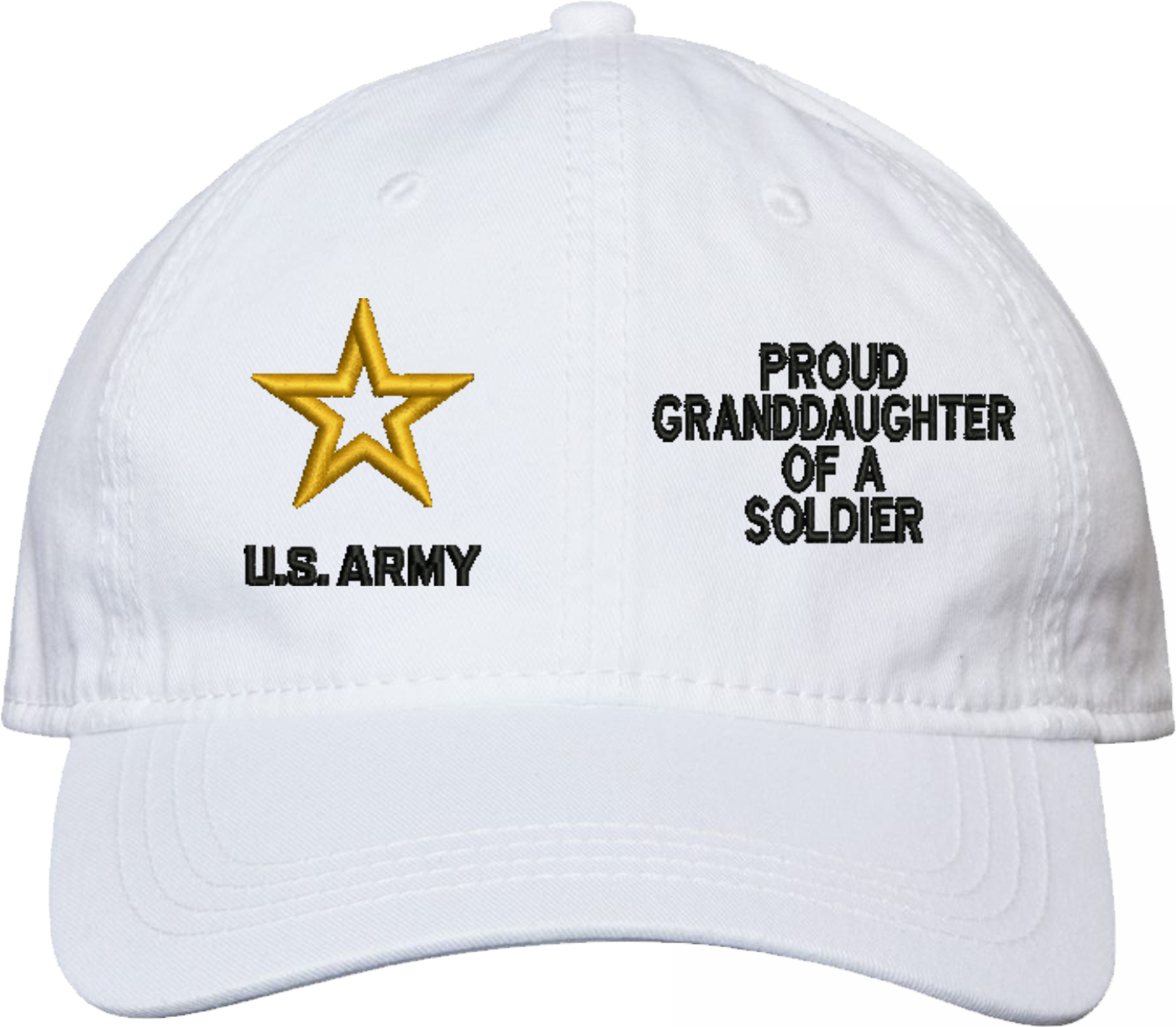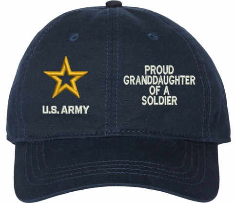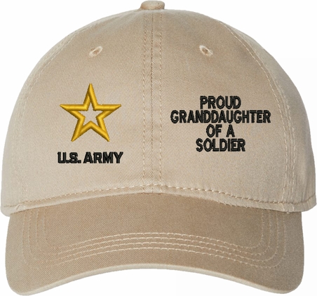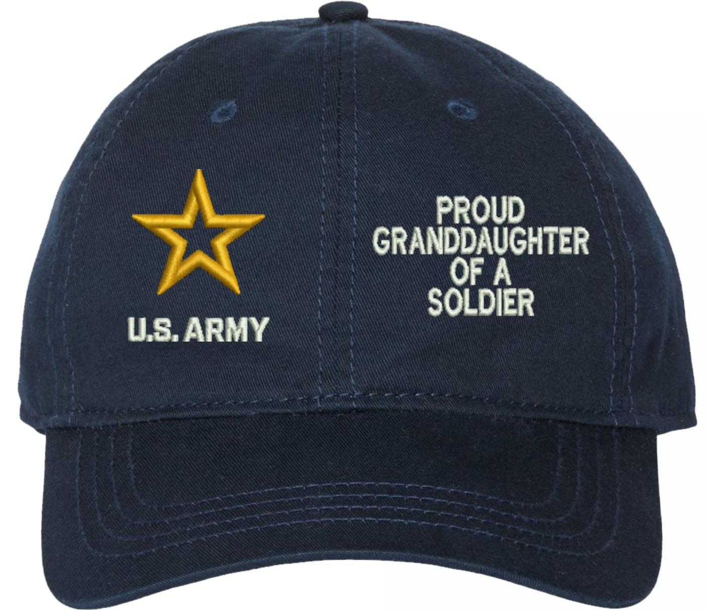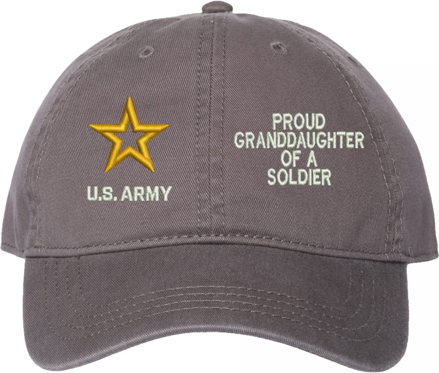 Show your Army pride with this Proud Granddaughter of a Soldier U.S. Army Unstructured Dad Cap from MilitaryBest. Crafted from 100% washed chino twill cotton, this six-panel, low-profile cap offers a relaxed and comfortable fit. Featuring high-quality embroidery done in our Scottsboro, Alabama facility, this cap is designed with a pre-curved visor and an adjustable tri-glide buckle closure for a perfect fit. Whether for everyday wear or as a meaningful gift, this cap is a great way to honor your own or a loved one's service.For caps ordered with custom embroidered personalized text please allow an additional 3 to 5 days production time. All custom back text will be embroidered in ALL CAPITAL LETTERS. Caps with back text or eggs are non-returnable unless there is a material defect in the cap.