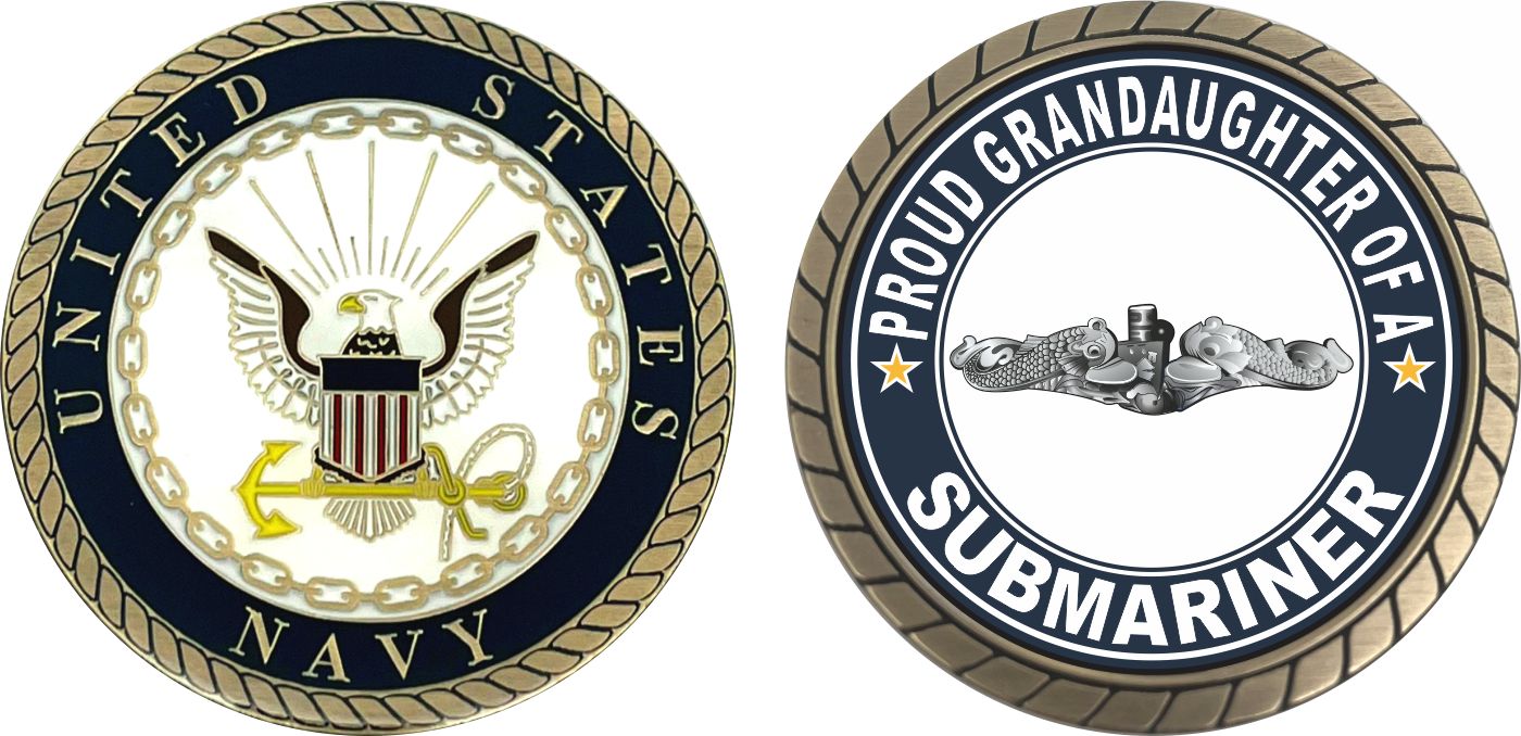 This 1 3/4” Proud Granddaughter of a Submariner Silver Dolphins Challenge Coin is proudly offered by MilitaryBest. This Officially Licensed Navy coin has beautiful enamel finish on one side and an organized crisp clean Proud Granddaughter of a Submariner design on the opposite side.