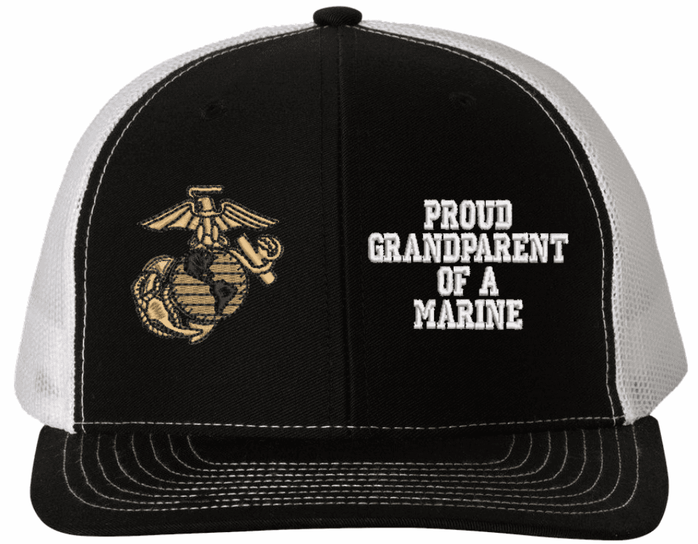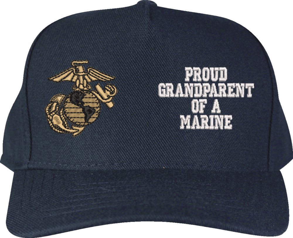 MilitaryBest is proud to offer this Proud GrandParent of a Marine U.S. Marine Corps Made in the USA Cap. The design of this U.S. Marine Corps Cap is crisp, clean, and sure to be loved by people of all ages! Select above from our many cap colors. This Proud GrandParent of a Marine U.S. Marine Corps Made in the USA Cap is crafted by our skilled embroidery technicians at our facilities in Scottsboro, AL. As with all MilitaryBest items, your satisfaction is guaranteed!Caps ordered with custom embroidered personalized back text require an additional 2 to 3 days production time. All custom back text will be embroidered in ALL CAPITAL LETTERS. Caps personalized with back text are non-returnable unless there is a material defect in the cap.