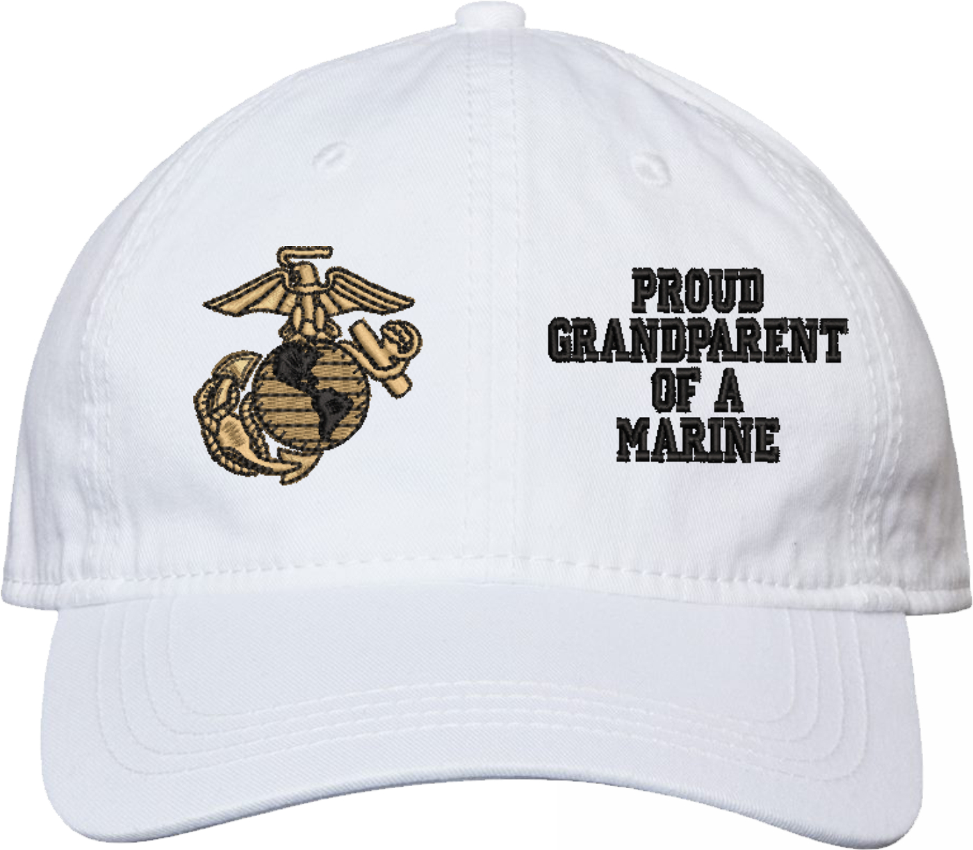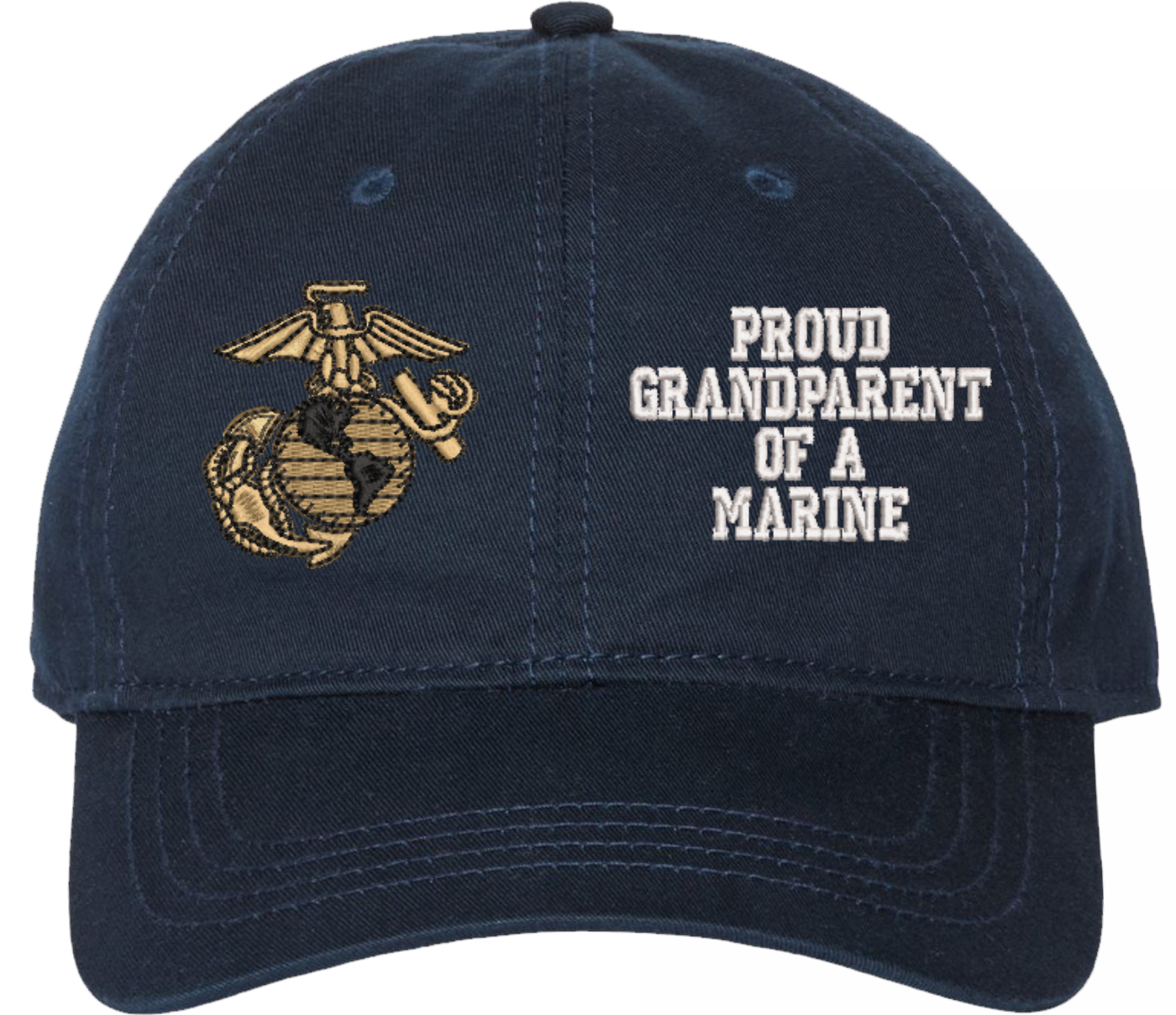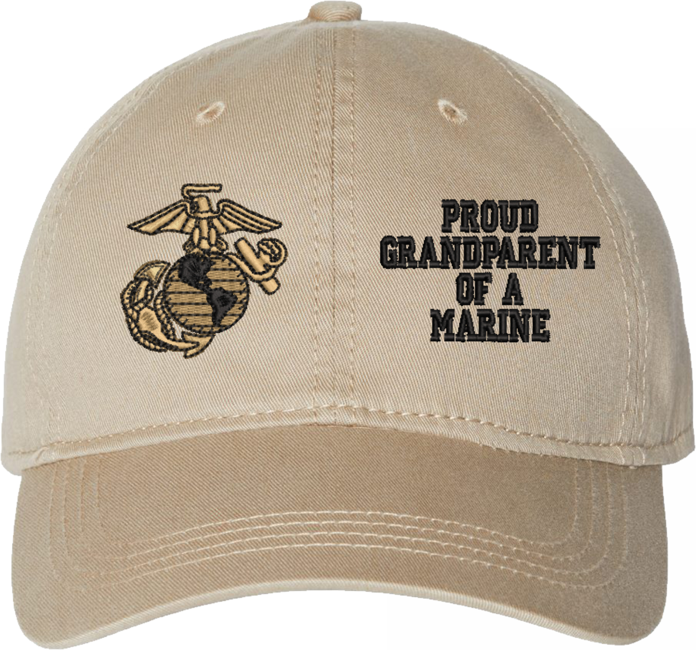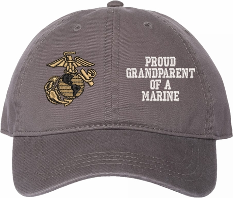 Show your Marine Corps pride with this Proud GrandParent of a Marine U.S. Marine Corps Unstructured Dad Cap from MilitaryBest. Crafted from 100% washed chino twill cotton, this six-panel, low-profile cap offers a relaxed and comfortable fit. Featuring high-quality embroidery done in our Scottsboro, Alabama facility, this cap is designed with a pre-curved visor and an adjustable tri-glide buckle closure for a perfect fit. Whether for everyday wear or as a meaningful gift, this cap is a great way to honor your own or a loved one's service.For caps ordered with custom embroidered personalized text please allow an additional 3 to 5 days production time. All custom back text will be embroidered in ALL CAPITAL LETTERS. Caps with back text or eggs are non-returnable unless there is a material defect in the cap.