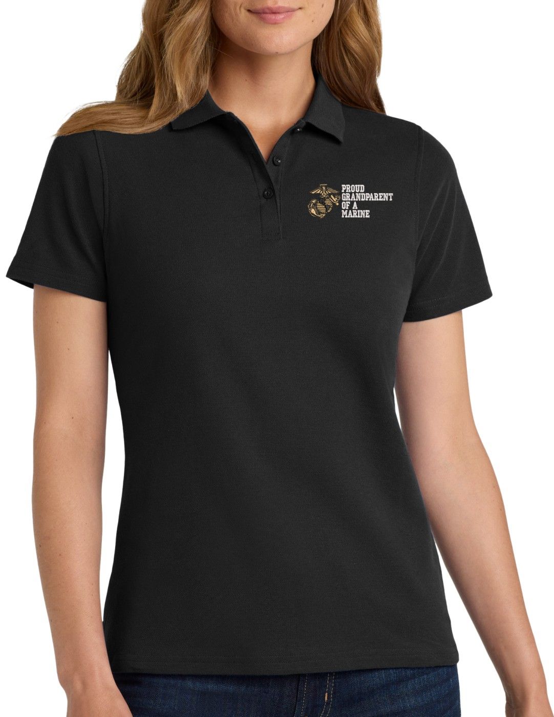 MilitaryBest is proud to offer this Proud GrandParent of a Marine U.S. Marine Corps Women's Stain-Release Polo. This polo is embroidered by our MilitaryBest team in Northeast Alabama. These polos are made with a stain-release finish for long-lasting wear, odor-fighting properties, and superior wrinkle and shrink resistance.Care Instructions: Machine Wash Cold With Like Colors. Do Not Use Fabric Softener. Do Not Bleach. Tumble Dry Low. Warm Iron If Necessary.