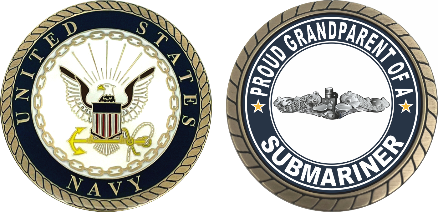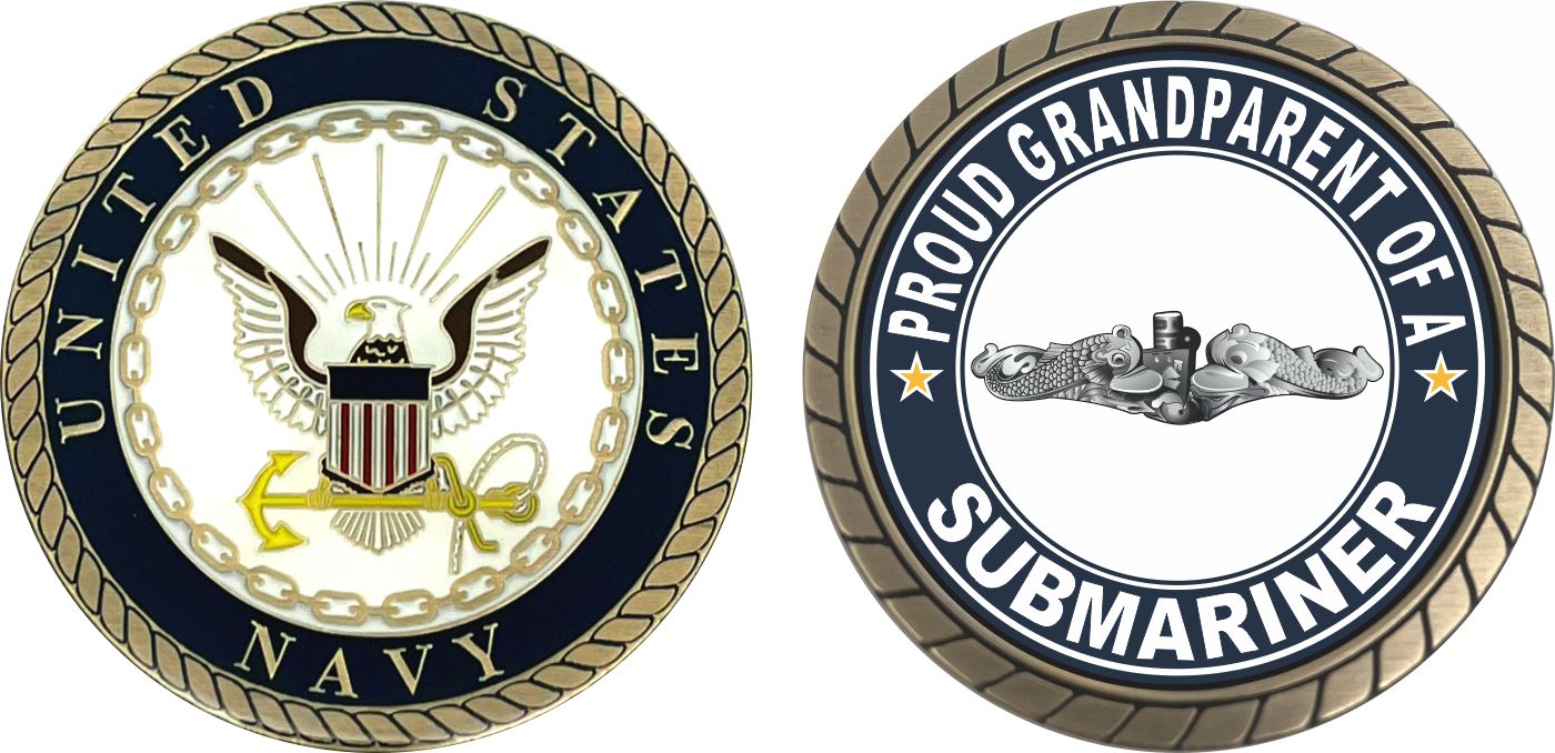This 1 3/4” Proud Grandparent of a Submariner Silver Dolphins Challenge Coin is proudly offered by MilitaryBest. This Officially Licensed Navy coin has beautiful enamel finish on one side and an organized crisp clean Proud Grandparent of a Submariner design on the opposite side.