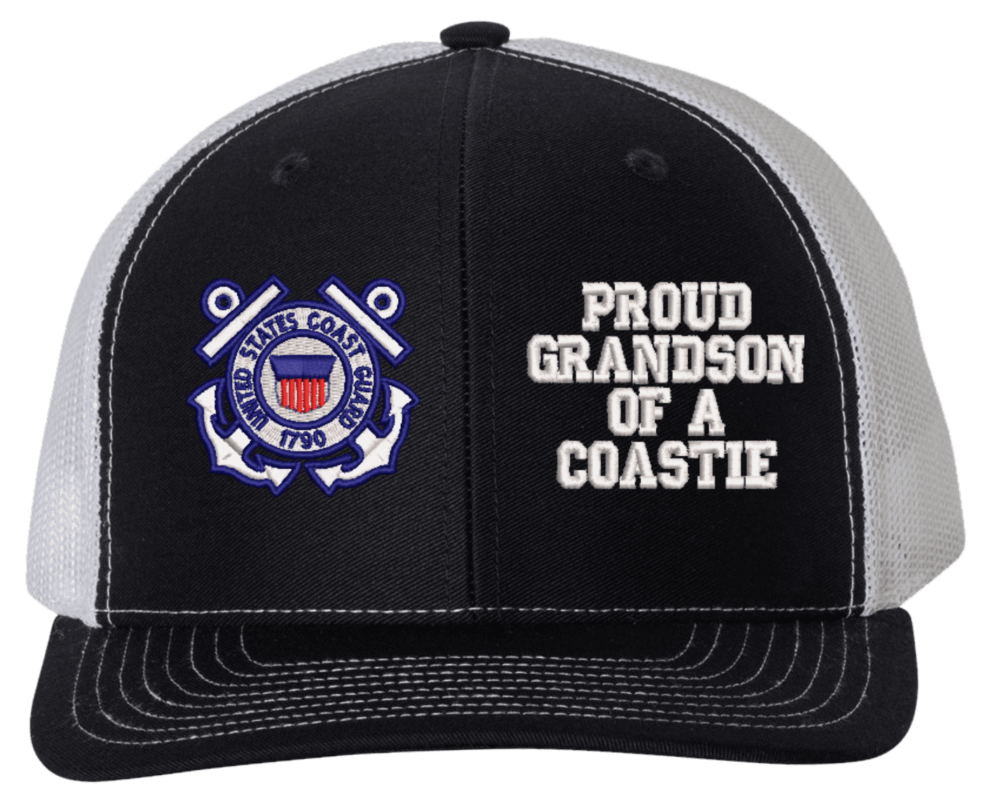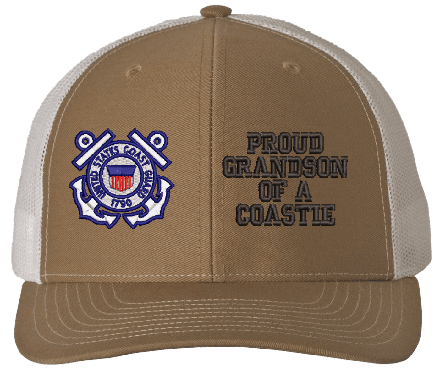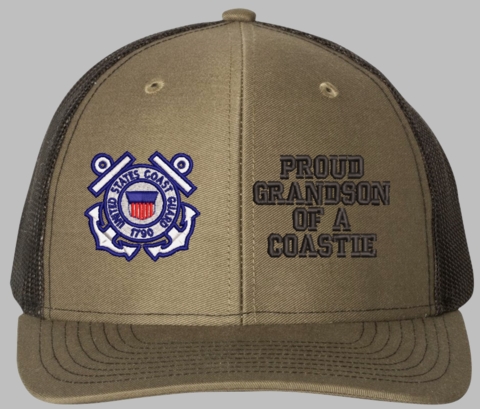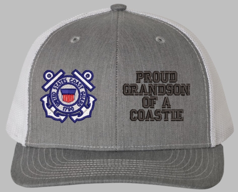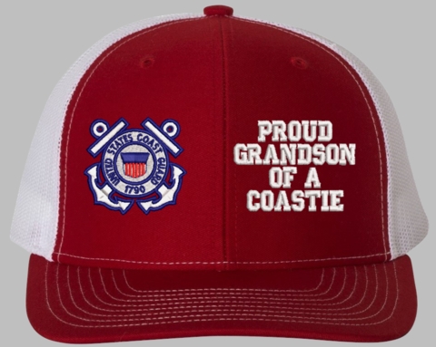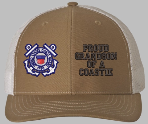 MilitaryBest is proud to offer this Proud Grandson of a Coastie U.S. Coast Guard Mesh Back Cap. The design of this U.S. Coast Guard Cap is crisp, clean, and sure to be loved by people of all ages! Select above from our many cap colors. This Proud Grandson of a Coastie U.S. Coast Guard Mesh Back Cap is crafted by our skilled embroidery technicians at our facilities in Scottsboro, AL. As with all MilitaryBest items, your satisfaction is guaranteed!Caps ordered with custom embroidered personalized back text require an additional 2 to 3 days production time. All custom back text will be embroidered in ALL CAPITAL LETTERS. Caps personalized with back text are non-returnable unless there is a material defect in the cap.