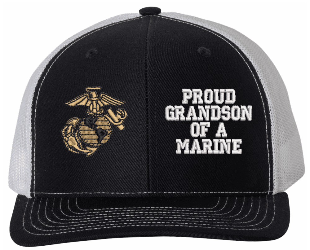 MilitaryBest is proud to offer this Proud Grandson of a Marine U.S. Marine Corps Made in the USA Cap. The design of this U.S. Marine Corps Cap is crisp, clean, and sure to be loved by people of all ages! Select above from our many cap colors. This Proud Grandson of a Marine U.S. Marine Corps Made in the USA Cap is crafted by our skilled embroidery technicians at our facilities in Scottsboro, AL. As with all MilitaryBest items, your satisfaction is guaranteed!Caps ordered with custom embroidered personalized back text require an additional 2 to 3 days production time. All custom back text will be embroidered in ALL CAPITAL LETTERS. Caps personalized with back text are non-returnable unless there is a material defect in the cap.