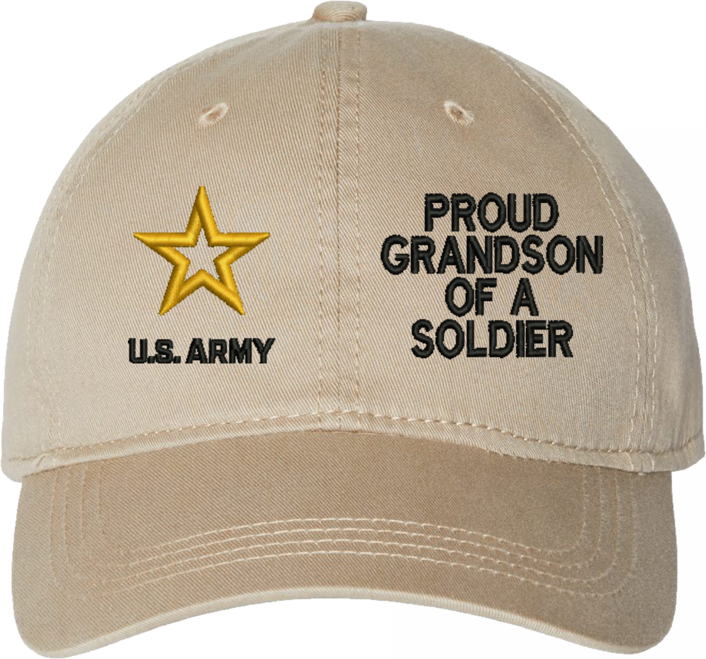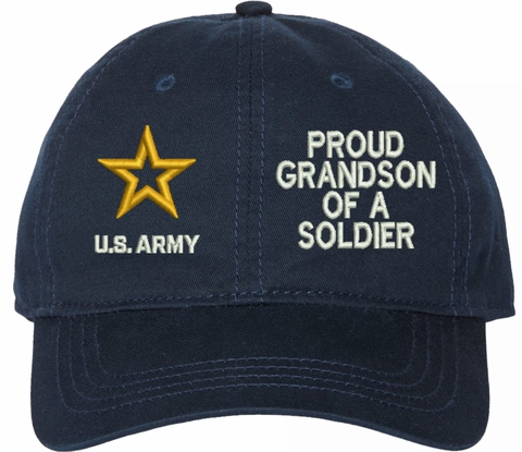 Show your Army pride with this Proud Grandson of a Soldier U.S. Army Unstructured Dad Cap from MilitaryBest. Crafted from 100% washed chino twill cotton, this six-panel, low-profile cap offers a relaxed and comfortable fit. Featuring high-quality embroidery done in our Scottsboro, Alabama facility, this cap is designed with a pre-curved visor and an adjustable tri-glide buckle closure for a perfect fit. Whether for everyday wear or as a meaningful gift, this cap is a great way to honor your own or a loved one's service.For caps ordered with custom embroidered personalized text please allow an additional 3 to 5 days production time. All custom back text will be embroidered in ALL CAPITAL LETTERS. Caps with back text or eggs are non-returnable unless there is a material defect in the cap.