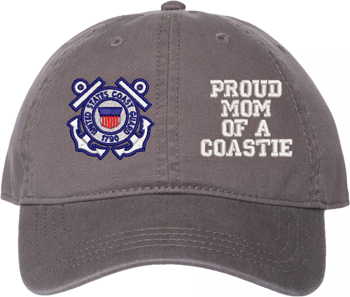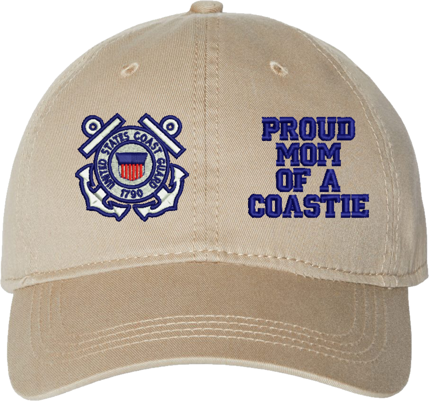 Show your Coast Guard pride with this Proud Mom of a Coastie U.S. Coast Guard Unstructured Dad Cap from MilitaryBest. Crafted from 100% washed chino twill cotton, this six-panel, low-profile cap offers a relaxed and comfortable fit. Featuring high-quality embroidery done in our Scottsboro, Alabama facility, this cap is designed with a pre-curved visor and an adjustable tri-glide buckle closure for a perfect fit. Whether for everyday wear or as a meaningful gift, this cap is a great way to honor your own or a loved one's service.For caps ordered with custom embroidered personalized text please allow an additional 3 to 5 days production time. All custom back text will be embroidered in ALL CAPITAL LETTERS. Caps with back text or eggs are non-returnable unless there is a material defect in the cap.
