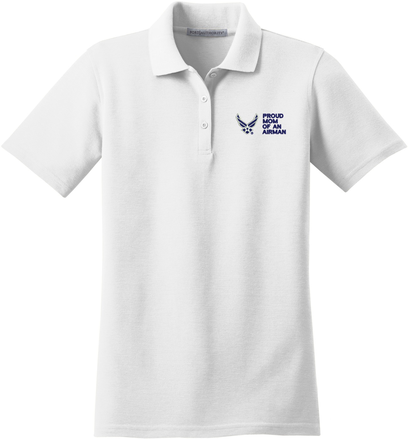 MilitaryBest is proud to offer this Proud Mom of an Airman U.S. Air Force Women's Stain-Release Polo. This polo is embroidered by our MilitaryBest team in Northeast Alabama. These polos are made with a stain-release finish for long-lasting wear, odor-fighting properties, and superior wrinkle and shrink resistance.Care Instructions: Machine Wash Cold With Like Colors. Do Not Use Fabric Softener. Do Not Bleach. Tumble Dry Low. Warm Iron If Necessary.