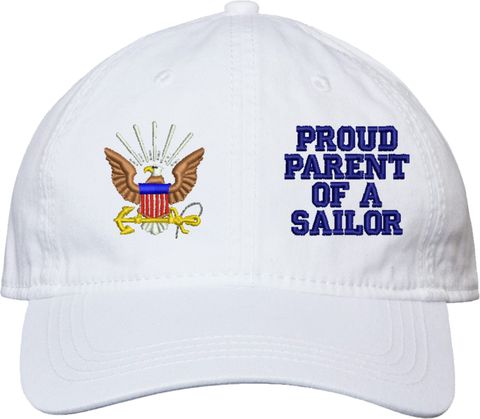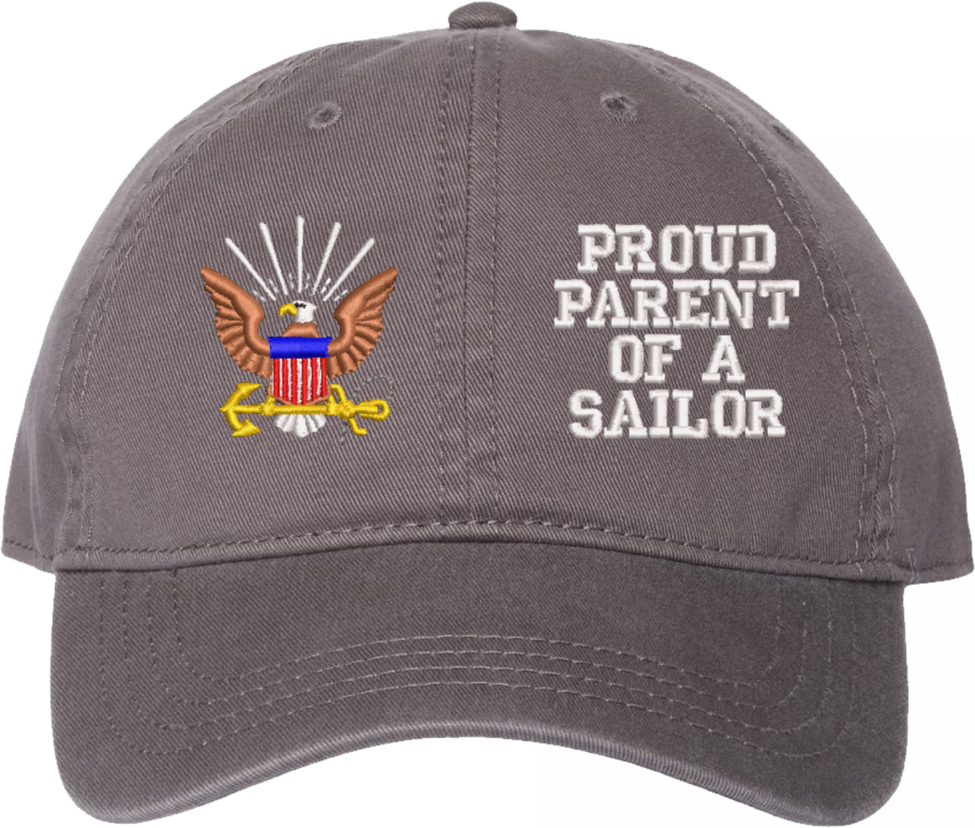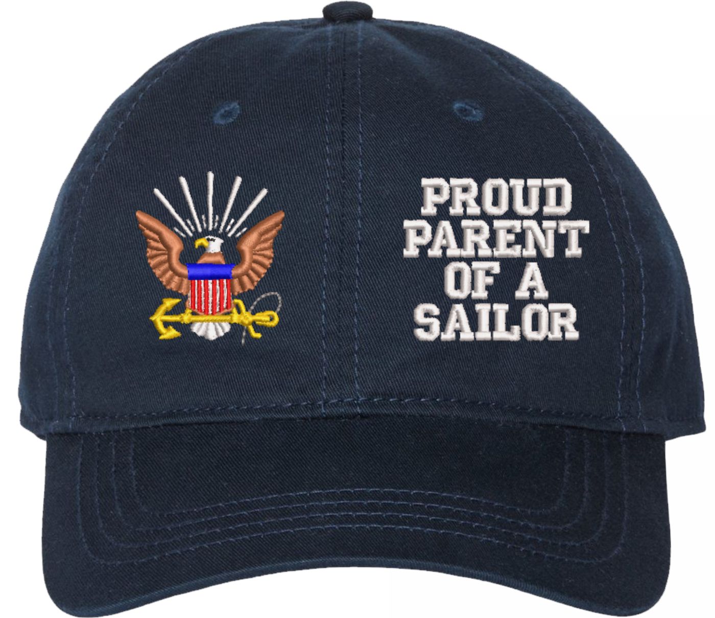 Show your Navy pride with this Proud Parent of a Sailor U.S. Navy Unstructured Dad Cap from MilitaryBest. Crafted from 100% washed chino twill cotton, this six-panel, low-profile cap offers a relaxed and comfortable fit. Featuring high-quality embroidery done in our Scottsboro, Alabama facility, this cap is designed with a pre-curved visor and an adjustable tri-glide buckle closure for a perfect fit. Whether for everyday wear or as a meaningful gift, this cap is a great way to honor your own or a loved one's service.For caps ordered with custom embroidered personalized text please allow an additional 3 to 5 days production time. All custom back text will be embroidered in ALL CAPITAL LETTERS. Caps with back text or eggs are non-returnable unless there is a material defect in the cap.