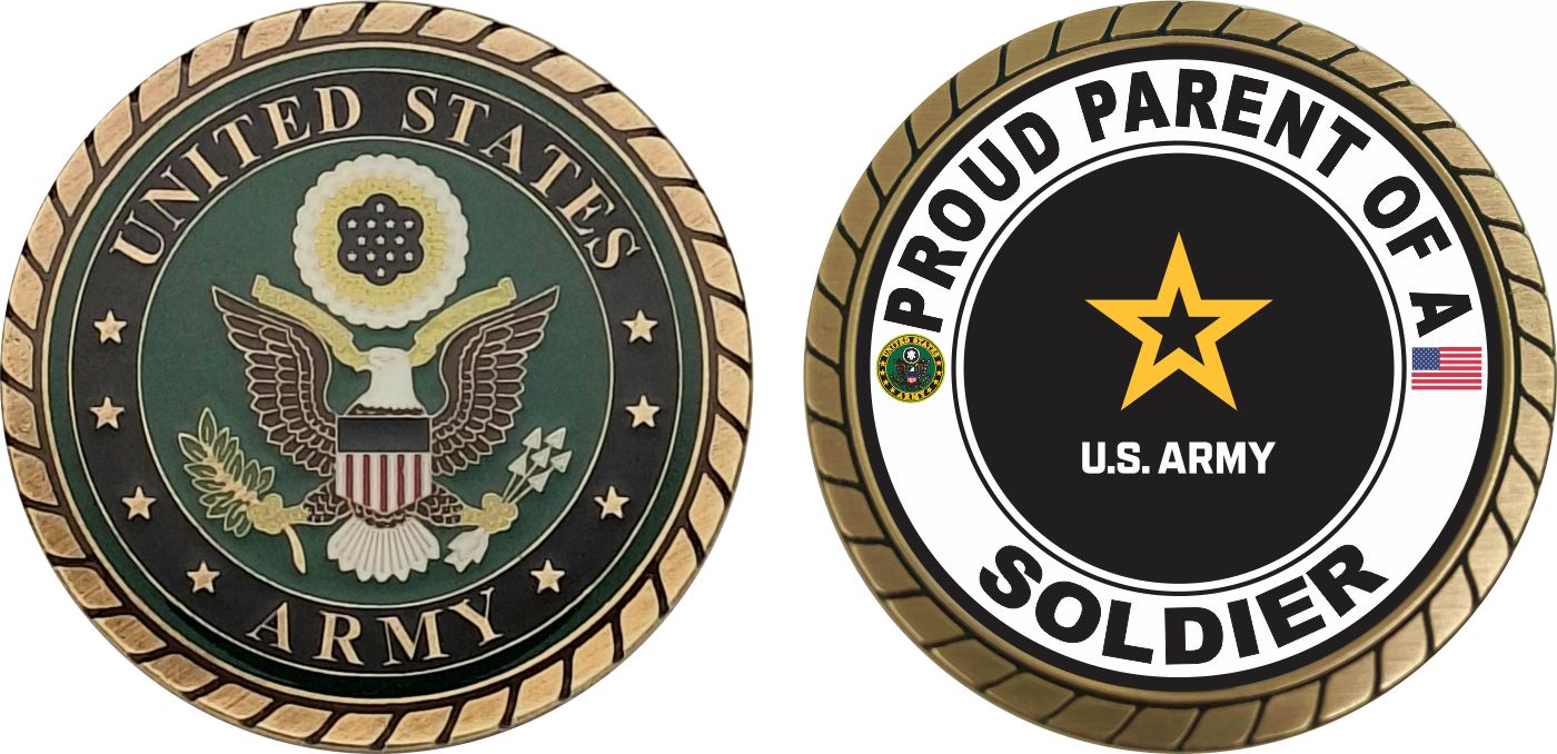 This 1 3/4” Proud Parent of a Soldier U.S. Army Challenge Coin is proudly offered by MilitaryBest. This Officially Licensed Army coin has beautiful enamel finish on one side and an organized crisp clean Proud Parent of a Soldier U.S. Army design on the opposite side.