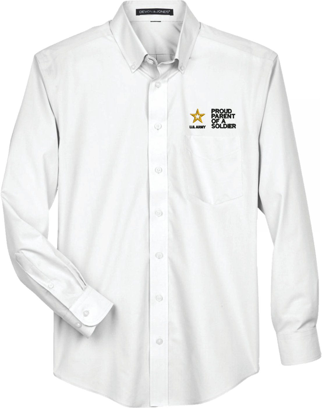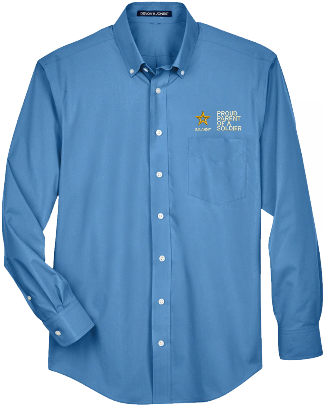 MilitaryBest has expanded its line of apparel with this Proud Parent of a Soldier U.S. Army Embroidered Dress Shirt. This long sleeve button down dress shirt is made using a stain-release, wrinkle-free, 55% cotton/45% polyester material. The pocket over the left chest measures 4 3/4" across. Featuring a Proud Parent of a Soldier U.S. Army design above the pocket, this shirt is embroidered to order at our facilities in Scottsboro, AL..- 55% cotton/45% polyester
