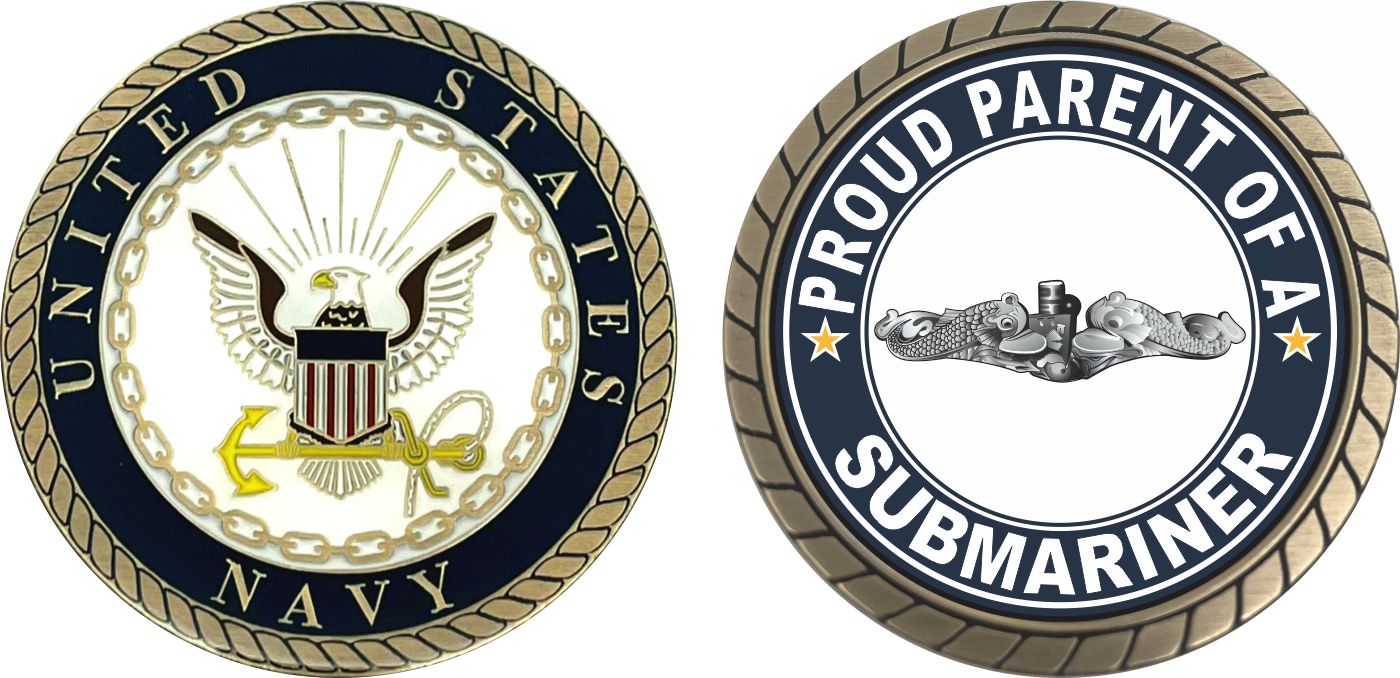 This 1 3/4” Proud Parent of a Submariner Silver Dolphins Challenge Coin is proudly offered by MilitaryBest. This Officially Licensed Navy coin has beautiful enamel finish on one side and an organized crisp clean Proud Parent of a Submariner design on the opposite side.