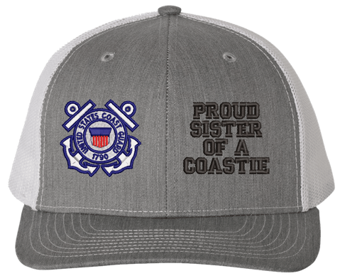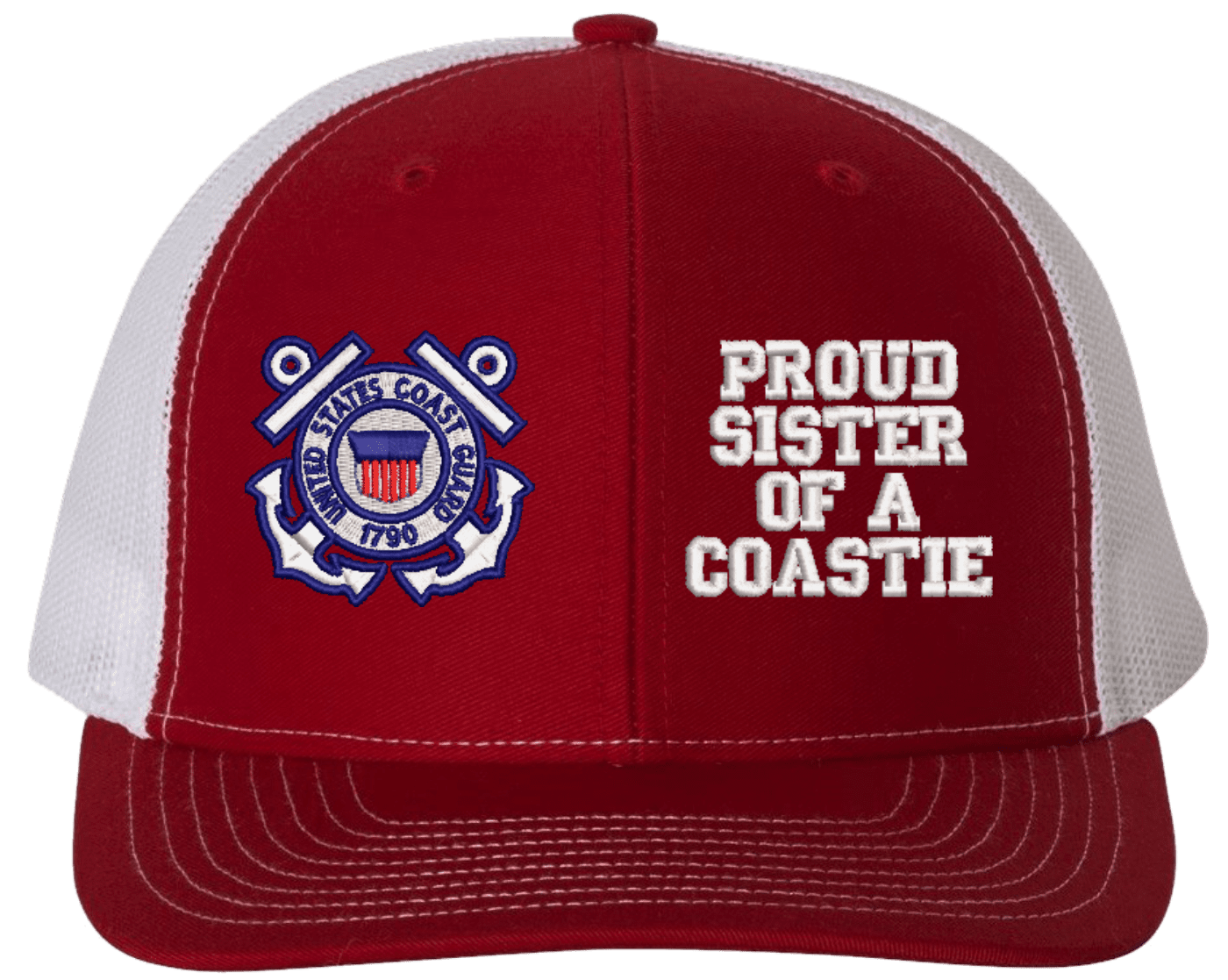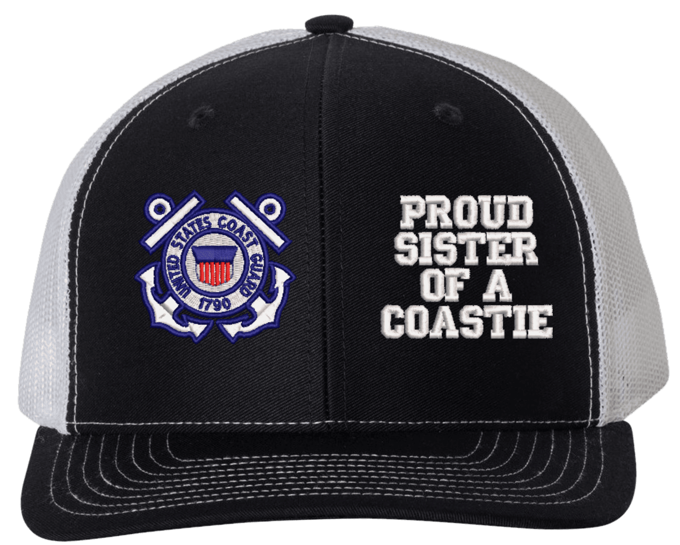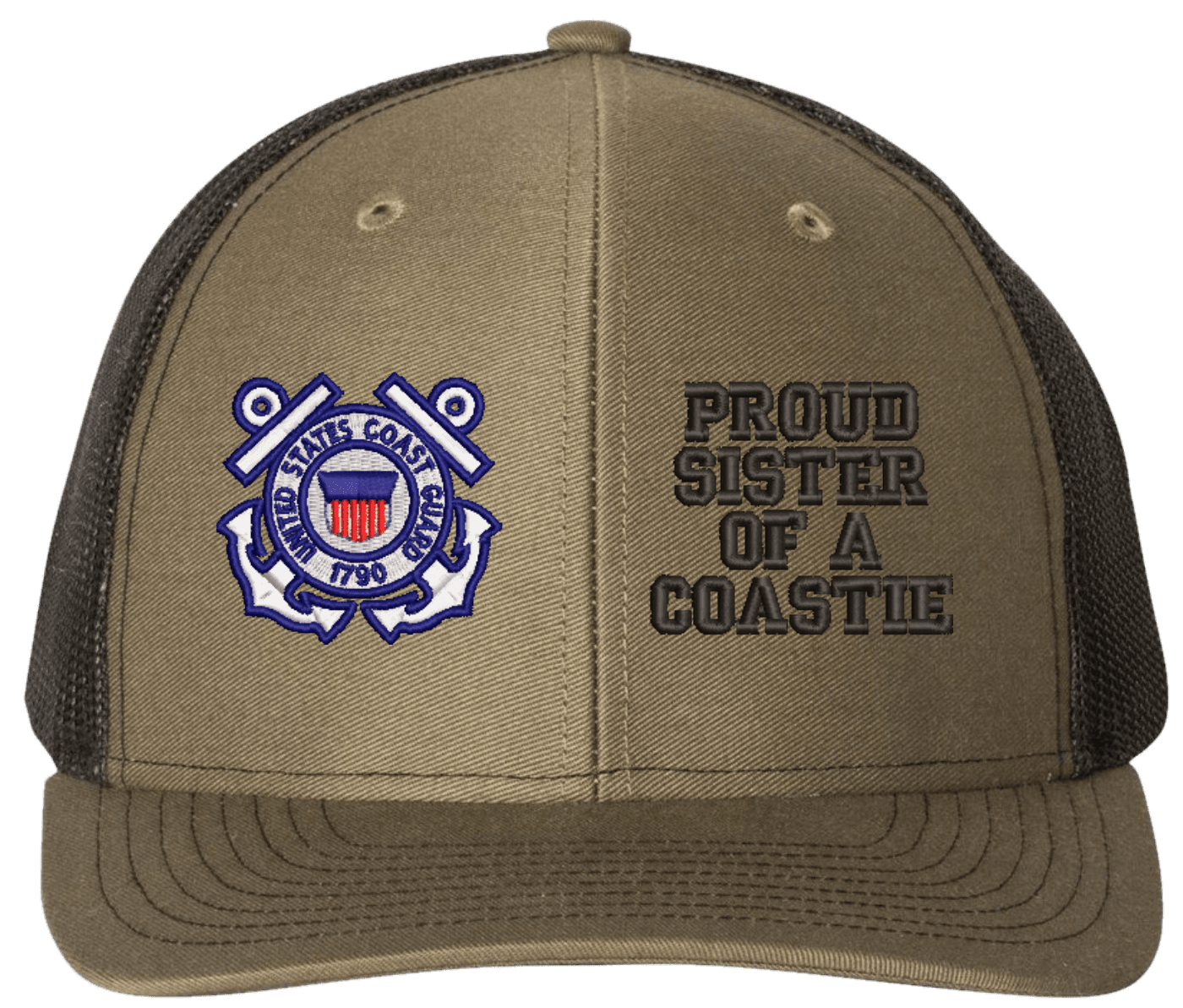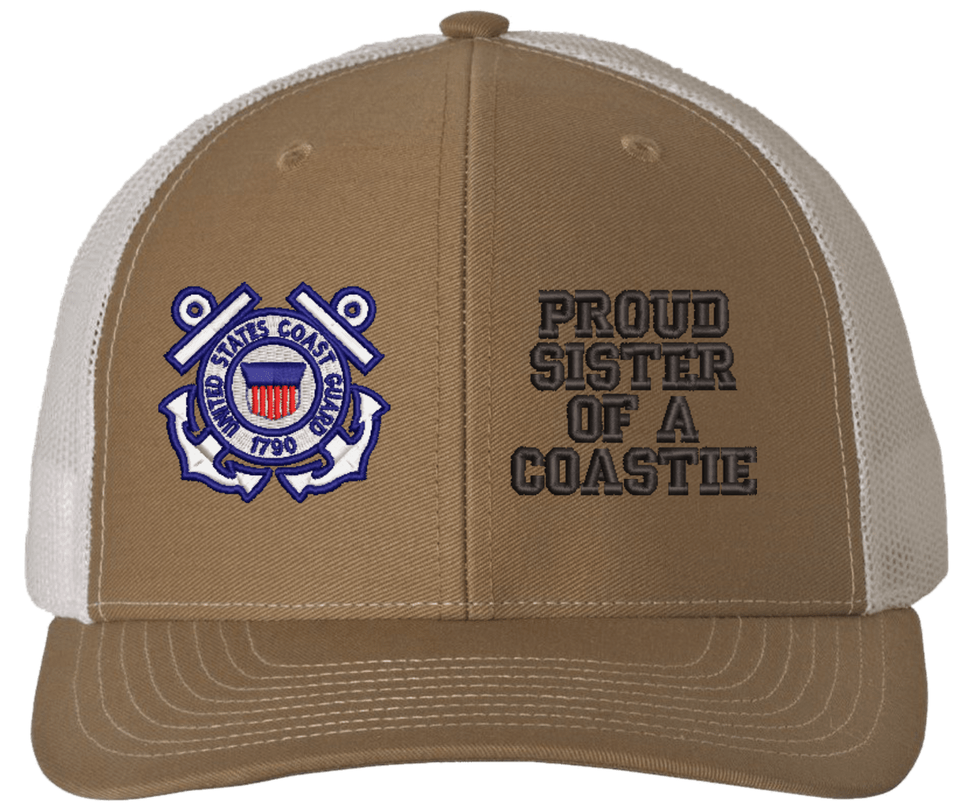 MilitaryBest is proud to offer this Proud Sister of a Coastie U.S. Coast Guard Mesh Back Cap. The design of this U.S. Coast Guard Cap is crisp, clean, and sure to be loved by people of all ages! Select above from our many cap colors. This Proud Sister of a Coastie U.S. Coast Guard Mesh Back Cap is crafted by our skilled embroidery technicians at our facilities in Scottsboro, AL. As with all MilitaryBest items, your satisfaction is guaranteed!Caps ordered with custom embroidered personalized back text require an additional 2 to 3 days production time. All custom back text will be embroidered in ALL CAPITAL LETTERS. Caps personalized with back text are non-returnable unless there is a material defect in the cap.