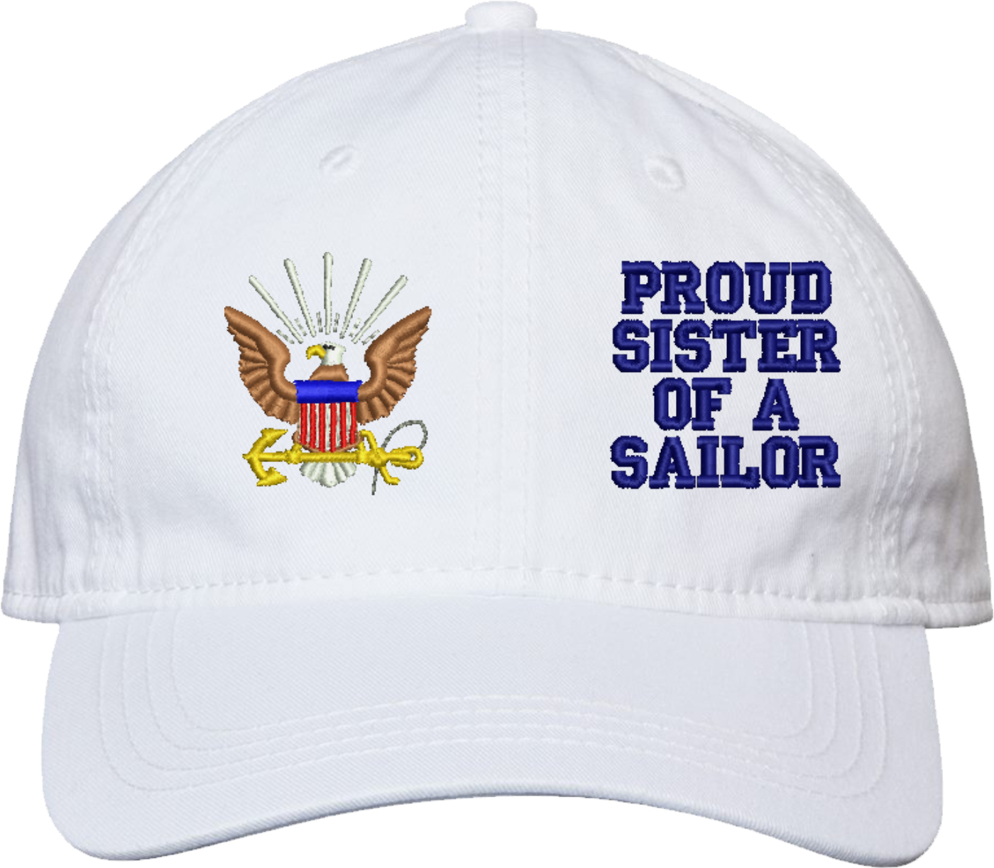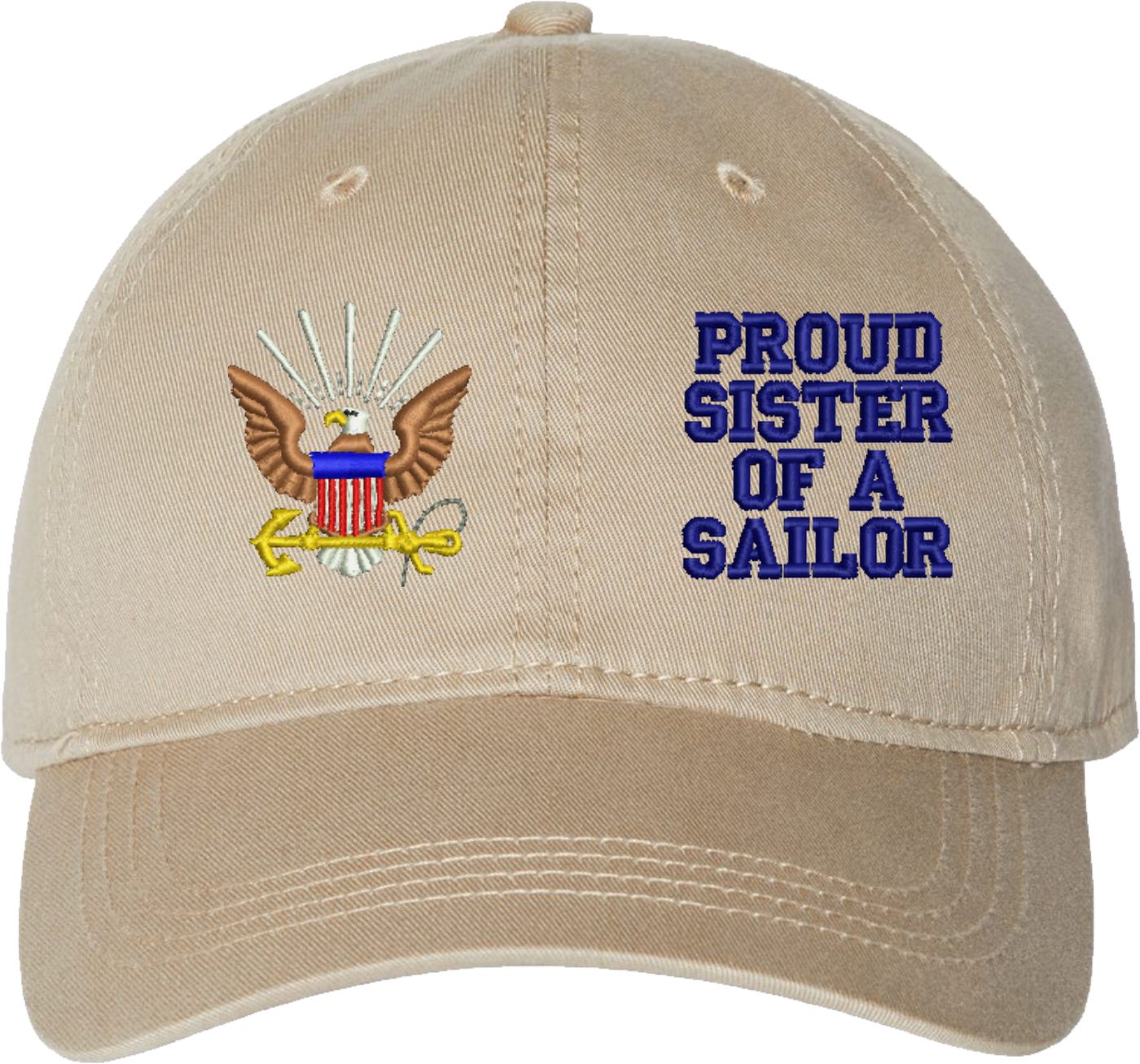 Show your Navy pride with this Proud Sister of a Sailor U.S. Navy Unstructured Dad Cap from MilitaryBest. Crafted from 100% washed chino twill cotton, this six-panel, low-profile cap offers a relaxed and comfortable fit. Featuring high-quality embroidery done in our Scottsboro, Alabama facility, this cap is designed with a pre-curved visor and an adjustable tri-glide buckle closure for a perfect fit. Whether for everyday wear or as a meaningful gift, this cap is a great way to honor your own or a loved one's service.For caps ordered with custom embroidered personalized text please allow an additional 3 to 5 days production time. All custom back text will be embroidered in ALL CAPITAL LETTERS. Caps with back text or eggs are non-returnable unless there is a material defect in the cap.