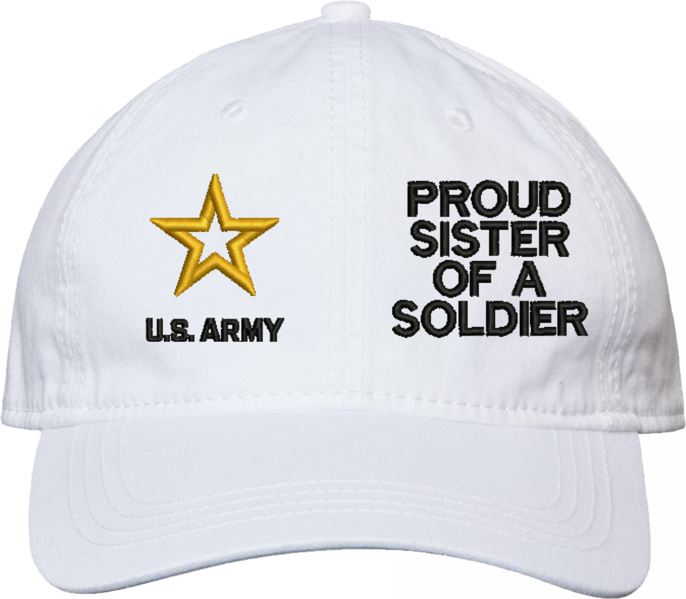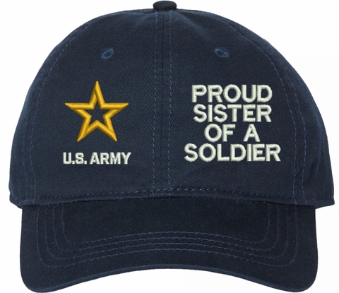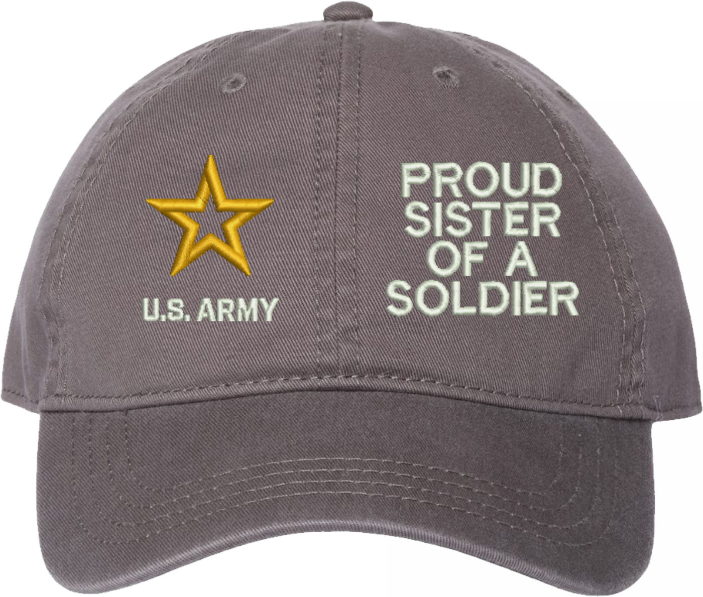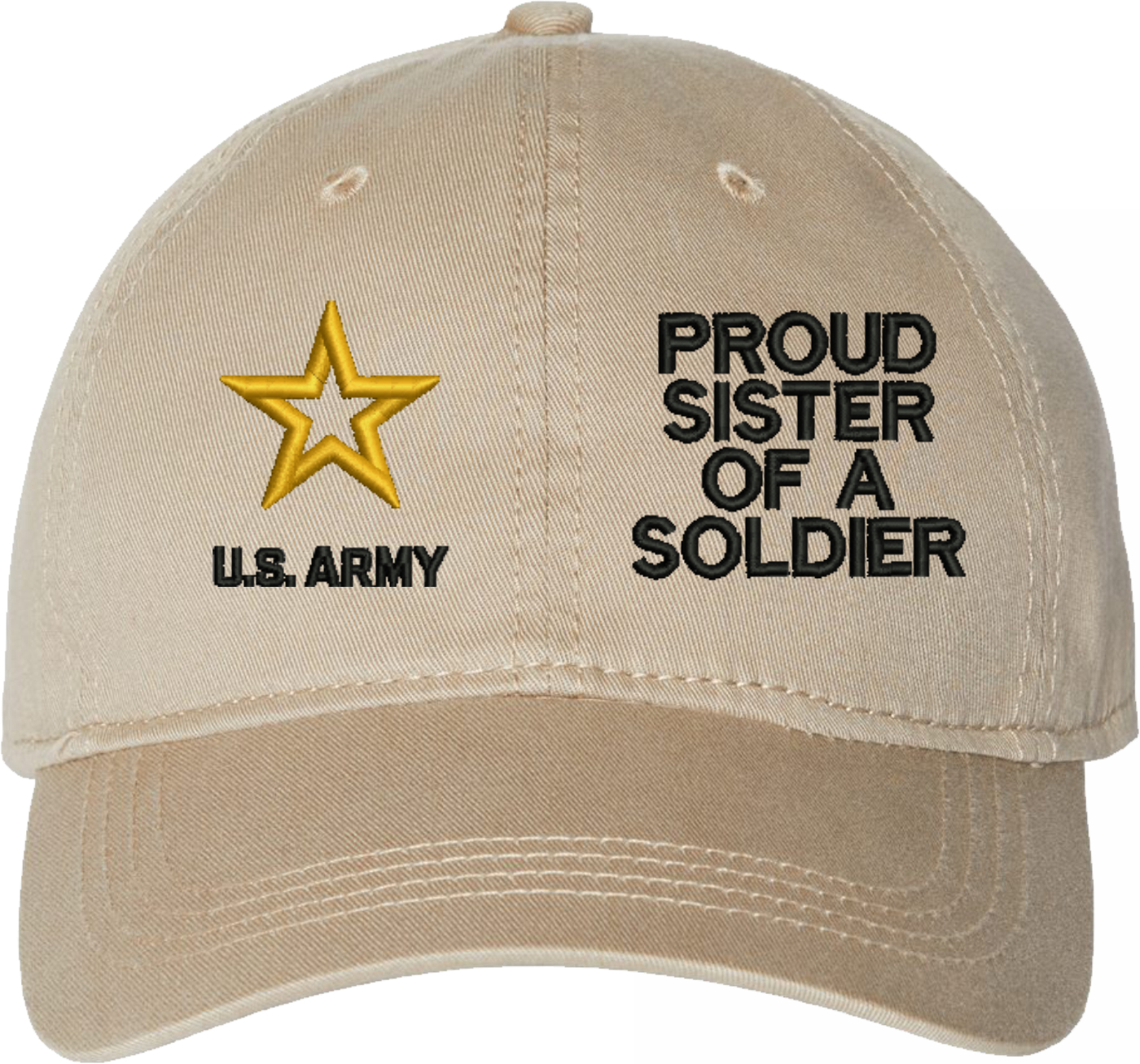 Show your Army pride with this Proud Sister of a Soldier U.S. Army Unstructured Dad Cap from MilitaryBest. Crafted from 100% washed chino twill cotton, this six-panel, low-profile cap offers a relaxed and comfortable fit. Featuring high-quality embroidery done in our Scottsboro, Alabama facility, this cap is designed with a pre-curved visor and an adjustable tri-glide buckle closure for a perfect fit. Whether for everyday wear or as a meaningful gift, this cap is a great way to honor your own or a loved one's service.For caps ordered with custom embroidered personalized text please allow an additional 3 to 5 days production time. All custom back text will be embroidered in ALL CAPITAL LETTERS. Caps with back text or eggs are non-returnable unless there is a material defect in the cap.