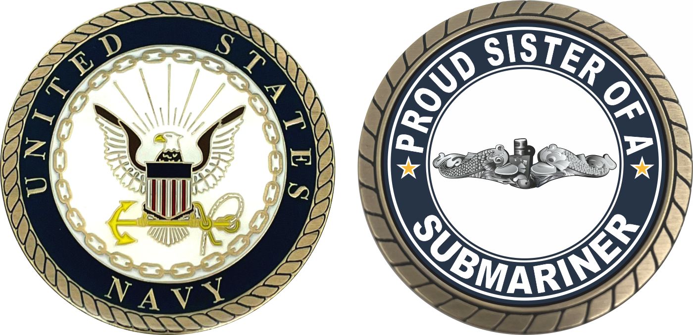 This 1 3/4” Proud Sister of a Submariner Silver Dolphins Challenge Coin is proudly offered by MilitaryBest. This Officially Licensed Navy coin has beautiful enamel finish on one side and an organized crisp clean Proud Sister of a Submariner design on the opposite side.