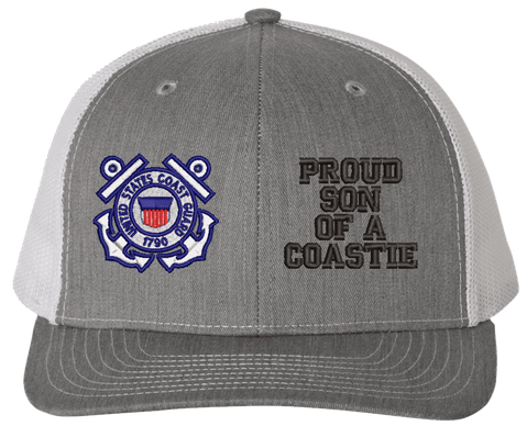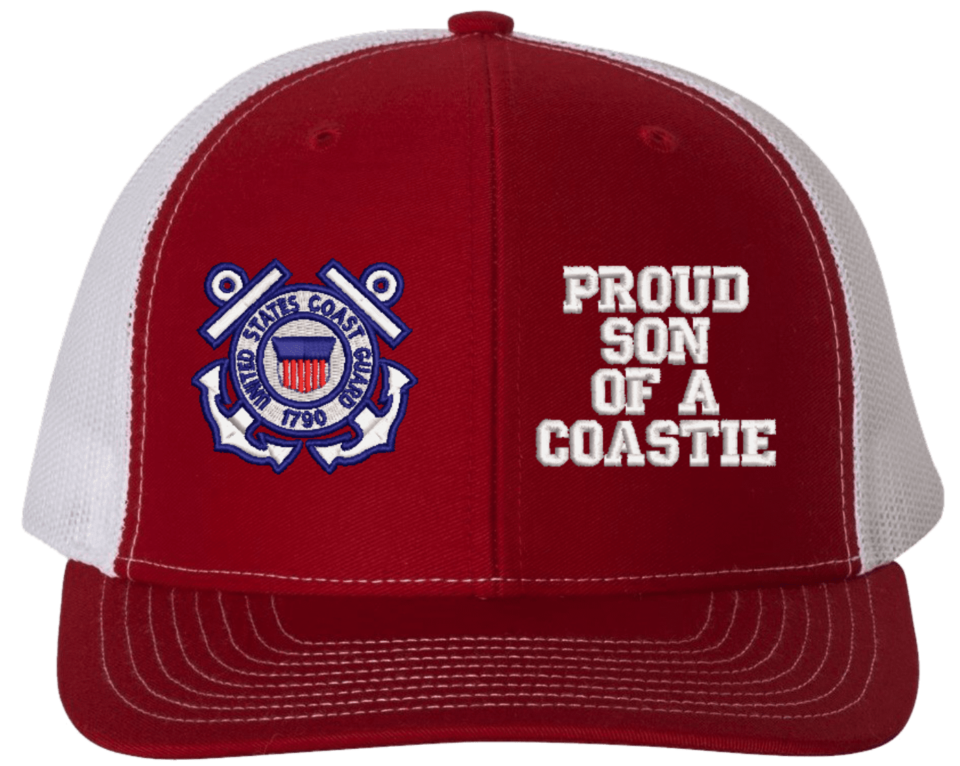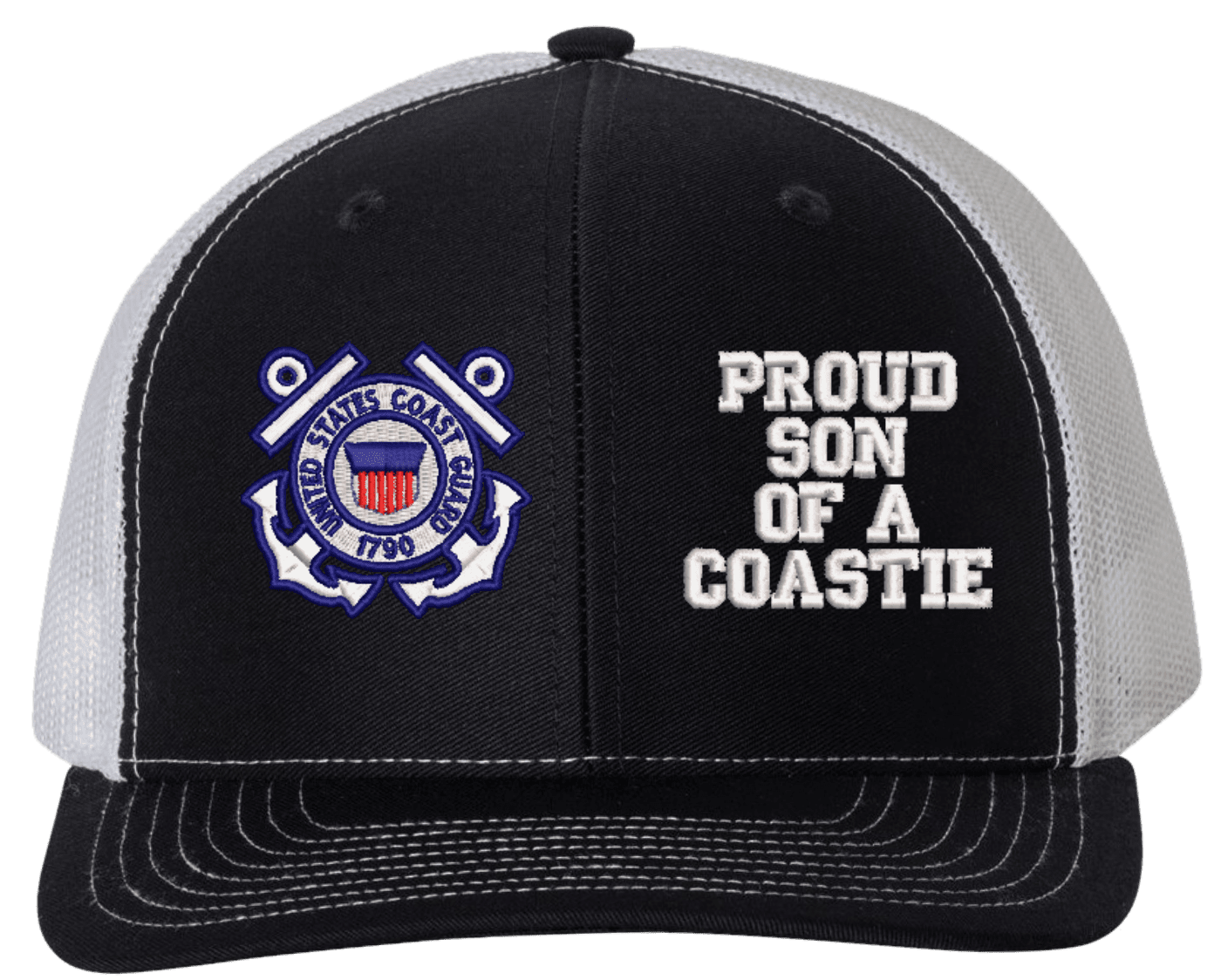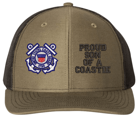 MilitaryBest is proud to offer this Proud Son of a Coastie U.S. Coast Guard Mesh Back Cap. The design of this U.S. Coast Guard Cap is crisp, clean, and sure to be loved by people of all ages! Select above from our many cap colors. This Proud Son of a Coastie U.S. Coast Guard Mesh Back Cap is crafted by our skilled embroidery technicians at our facilities in Scottsboro, AL. As with all MilitaryBest items, your satisfaction is guaranteed!Caps ordered with custom embroidered personalized back text require an additional 2 to 3 days production time. All custom back text will be embroidered in ALL CAPITAL LETTERS. Caps personalized with back text are non-returnable unless there is a material defect in the cap.