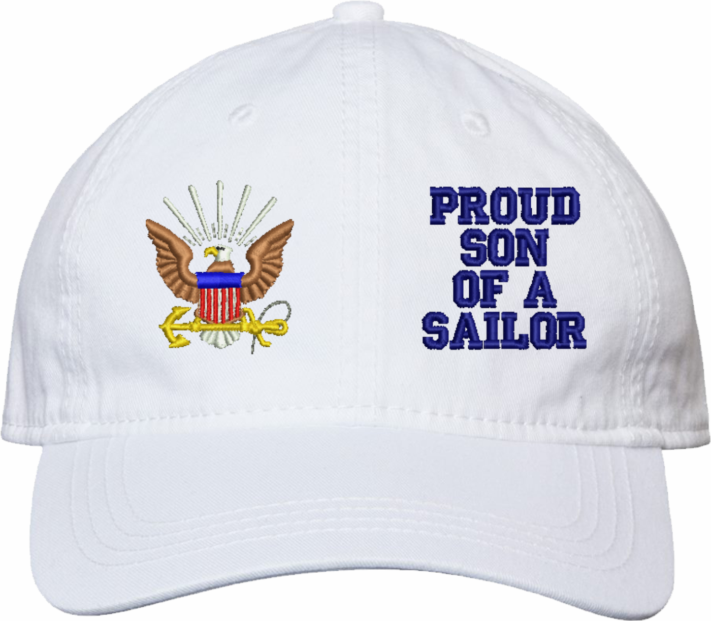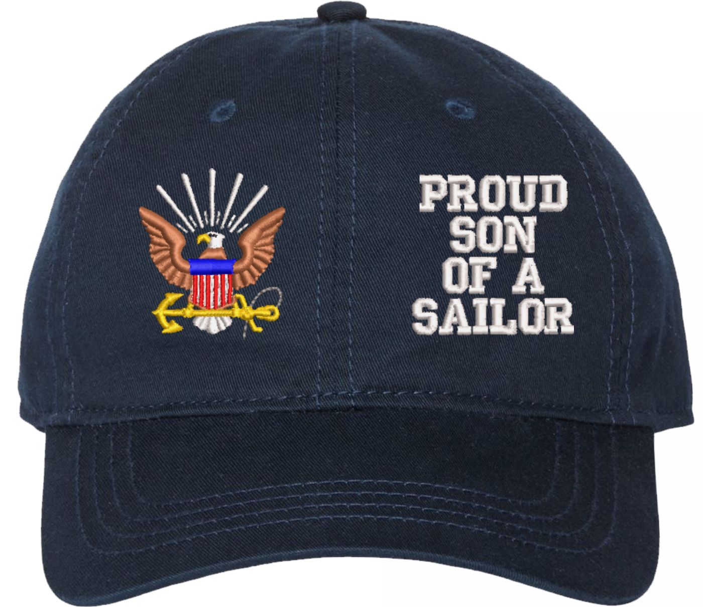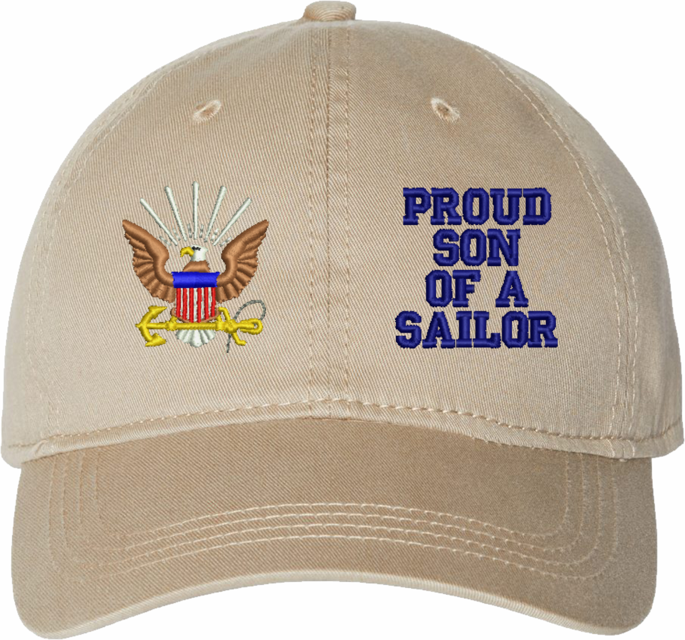 Show your Navy pride with this Proud Son of a Sailor U.S. Navy Unstructured Dad Cap from MilitaryBest. Crafted from 100% washed chino twill cotton, this six-panel, low-profile cap offers a relaxed and comfortable fit. Featuring high-quality embroidery done in our Scottsboro, Alabama facility, this cap is designed with a pre-curved visor and an adjustable tri-glide buckle closure for a perfect fit. Whether for everyday wear or as a meaningful gift, this cap is a great way to honor your own or a loved one's service.For caps ordered with custom embroidered personalized text please allow an additional 3 to 5 days production time. All custom back text will be embroidered in ALL CAPITAL LETTERS. Caps with back text or eggs are non-returnable unless there is a material defect in the cap.