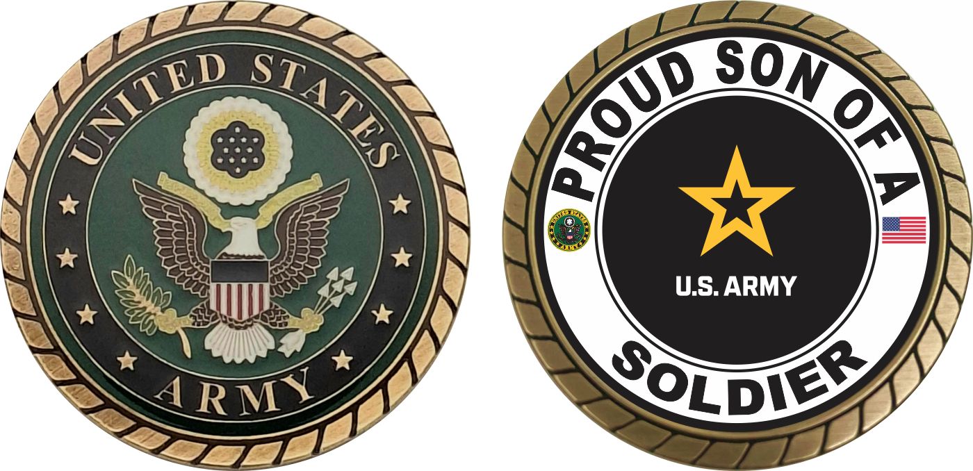 This 1 3/4” Proud Son of a Soldier U.S. Army Challenge Coin is proudly offered by MilitaryBest. This Officially Licensed Army coin has beautiful enamel finish on one side and an organized crisp clean Proud Son of a Soldier U.S. Army design on the opposite side.