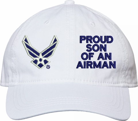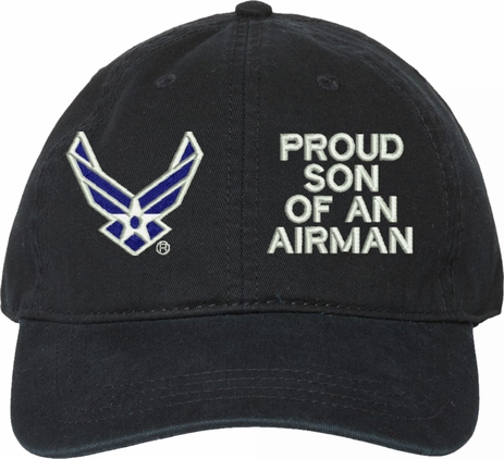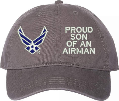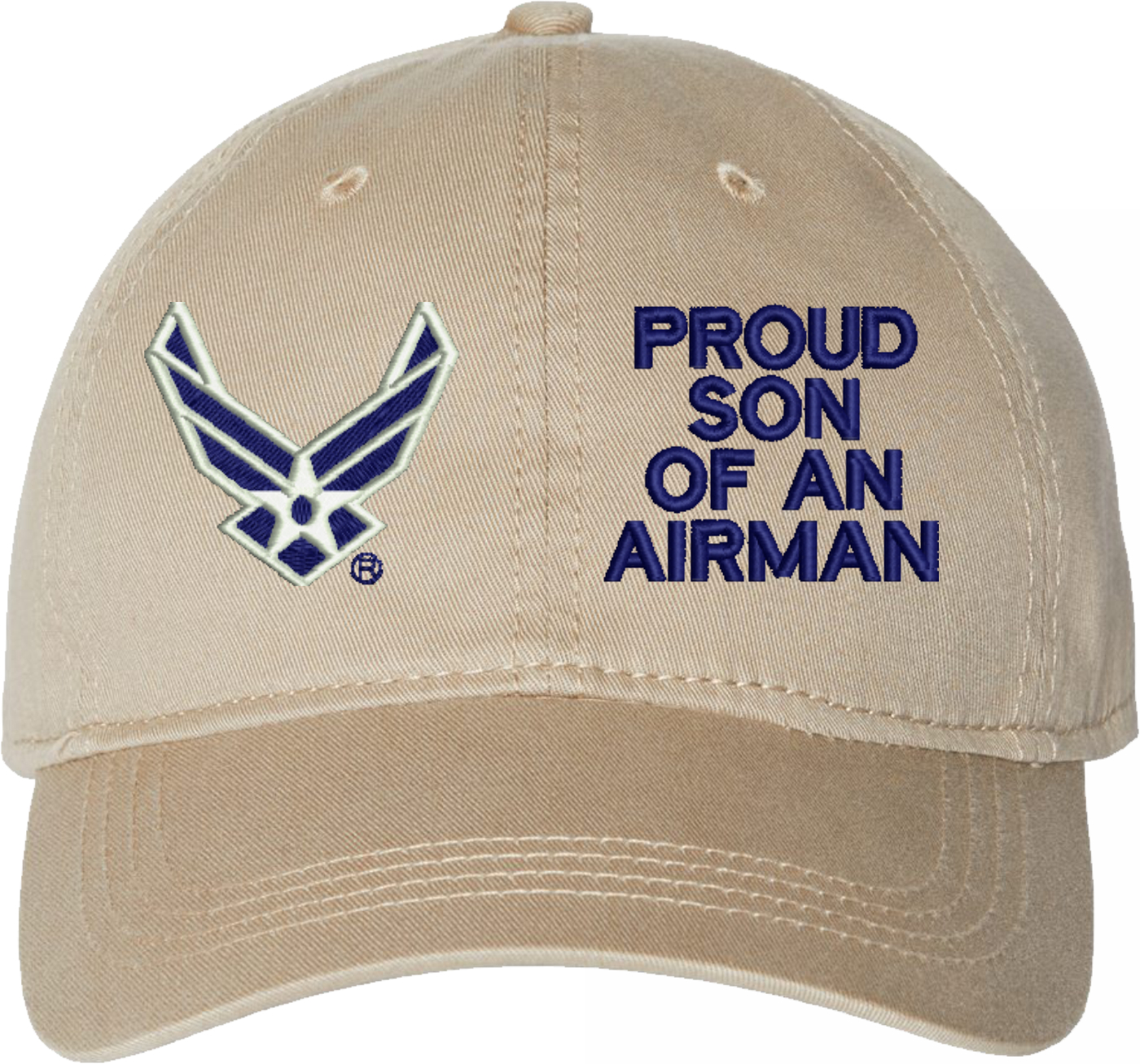 Show your Air Force pride with this Proud Son of an Airman U.S. Air Force Unstructured Dad Cap from MilitaryBest. Crafted from 100% washed chino twill cotton, this six-panel, low-profile cap offers a relaxed and comfortable fit. Featuring high-quality embroidery done in our Scottsboro, Alabama facility, this cap is designed with a pre-curved visor and an adjustable tri-glide buckle closure for a perfect fit. Whether for everyday wear or as a meaningful gift, this cap is a great way to honor your own or a loved one's service.For caps ordered with custom embroidered personalized text please allow an additional 3 to 5 days production time. All custom back text will be embroidered in ALL CAPITAL LETTERS. Caps with back text or eggs are non-returnable unless there is a material defect in the cap.
