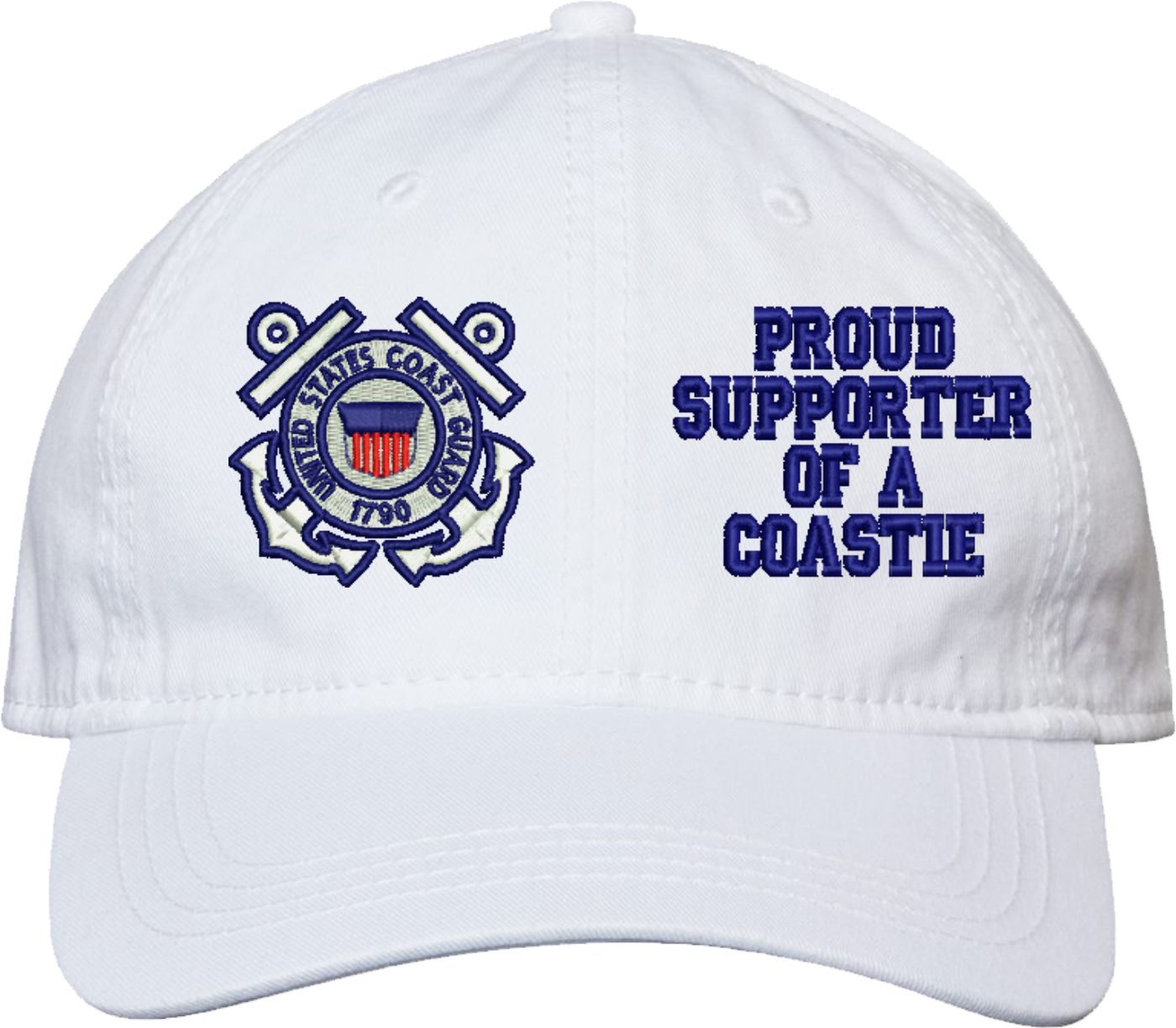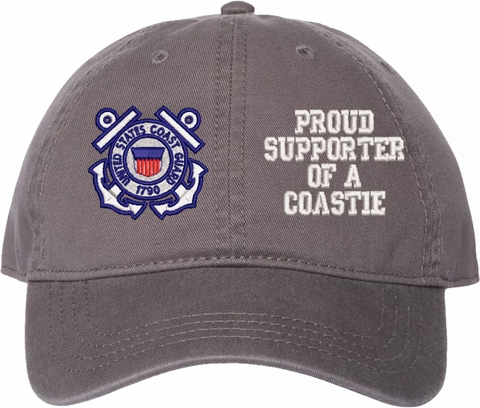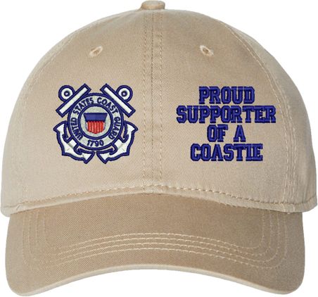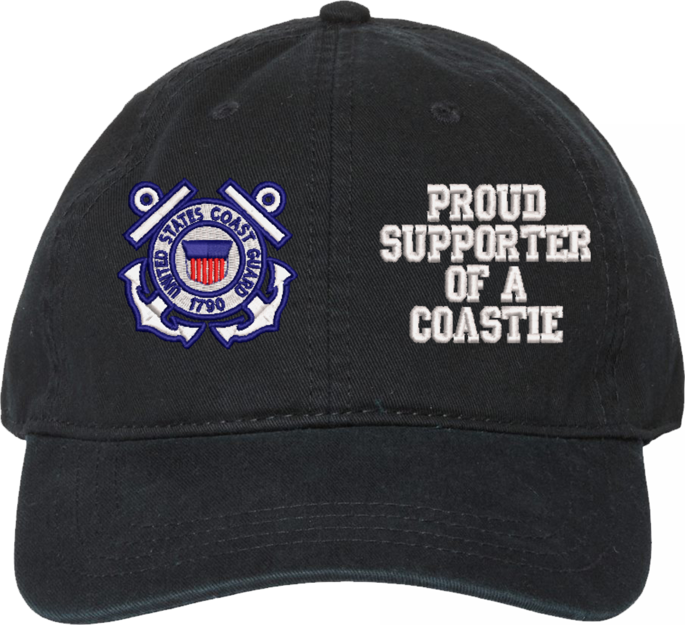 Show your Coast Guard pride with this Proud Supporter of a Coastie U.S. Coast Guard Unstructured Dad Cap from MilitaryBest. Crafted from 100% washed chino twill cotton, this six-panel, low-profile cap offers a relaxed and comfortable fit. Featuring high-quality embroidery done in our Scottsboro, Alabama facility, this cap is designed with a pre-curved visor and an adjustable tri-glide buckle closure for a perfect fit. Whether for everyday wear or as a meaningful gift, this cap is a great way to honor your own or a loved one's service.For caps ordered with custom embroidered personalized text please allow an additional 3 to 5 days production time. All custom back text will be embroidered in ALL CAPITAL LETTERS. Caps with back text or eggs are non-returnable unless there is a material defect in the cap.