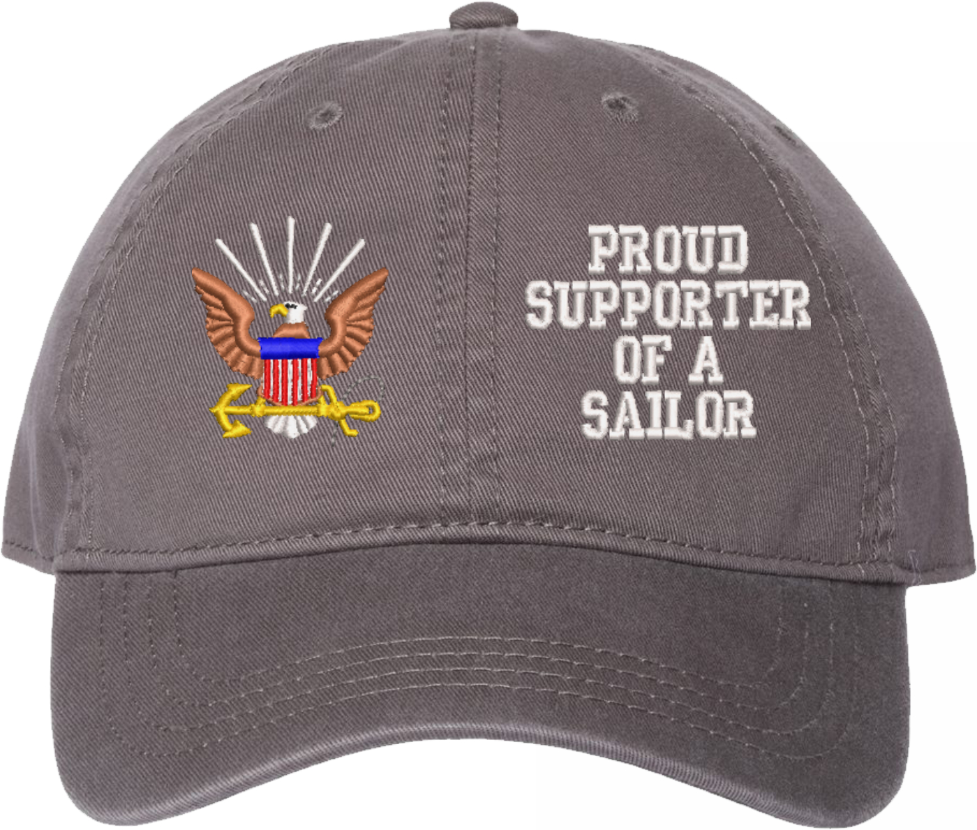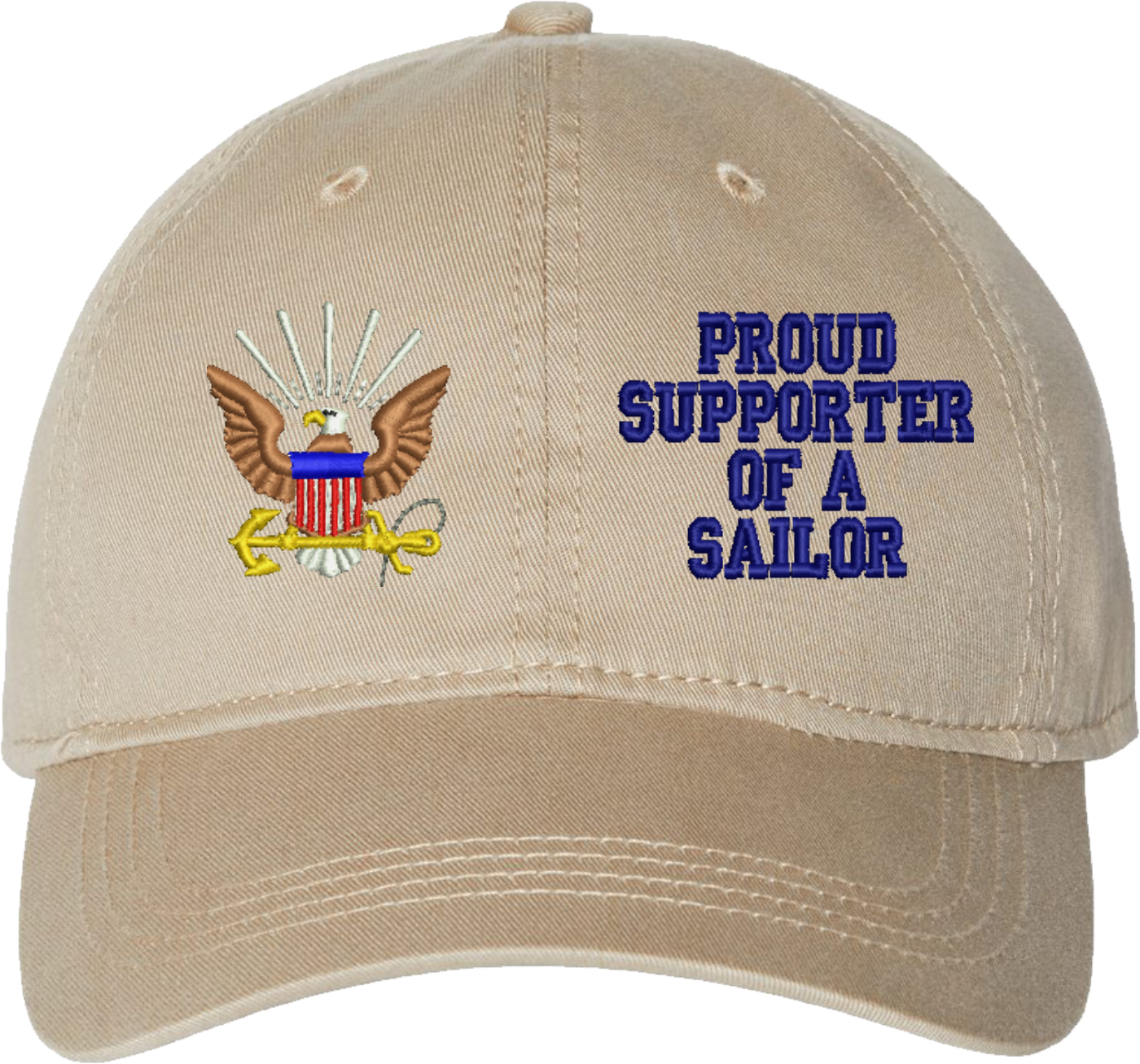 Show your Navy pride with this Proud Supporter of a Sailor U.S. Navy Unstructured Dad Cap from MilitaryBest. Crafted from 100% washed chino twill cotton, this six-panel, low-profile cap offers a relaxed and comfortable fit. Featuring high-quality embroidery done in our Scottsboro, Alabama facility, this cap is designed with a pre-curved visor and an adjustable tri-glide buckle closure for a perfect fit. Whether for everyday wear or as a meaningful gift, this cap is a great way to honor your own or a loved one's service.For caps ordered with custom embroidered personalized text please allow an additional 3 to 5 days production time. All custom back text will be embroidered in ALL CAPITAL LETTERS. Caps with back text or eggs are non-returnable unless there is a material defect in the cap.