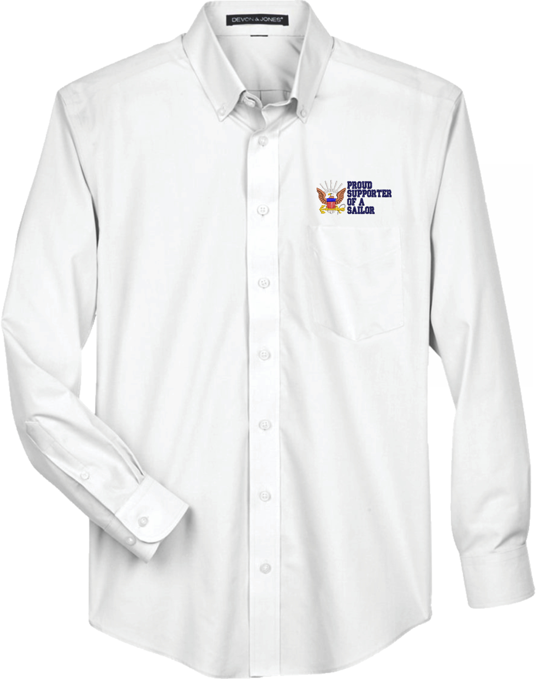 MilitaryBest has expanded its line of apparel with this Proud Supporter of a Sailor U.S. Navy Embroidered Dress Shirt. This long sleeve button down dress shirt is made using a stain-release, wrinkle-free, 55% cotton/45% polyester material. The pocket over the left chest measures 4 3/4" across. Featuring a Proud Supporter of a Sailor U.S. Navy design above the pocket, this shirt is embroidered to order at our facilities in Scottsboro, AL..- 55% cotton/45% polyester