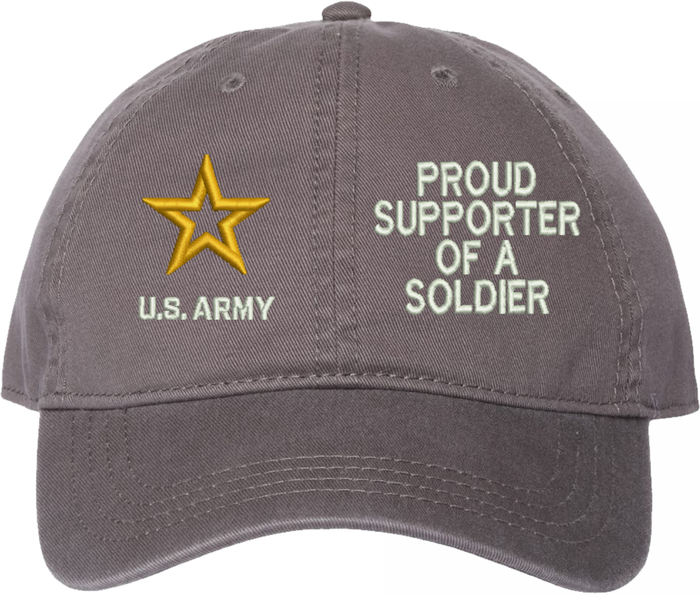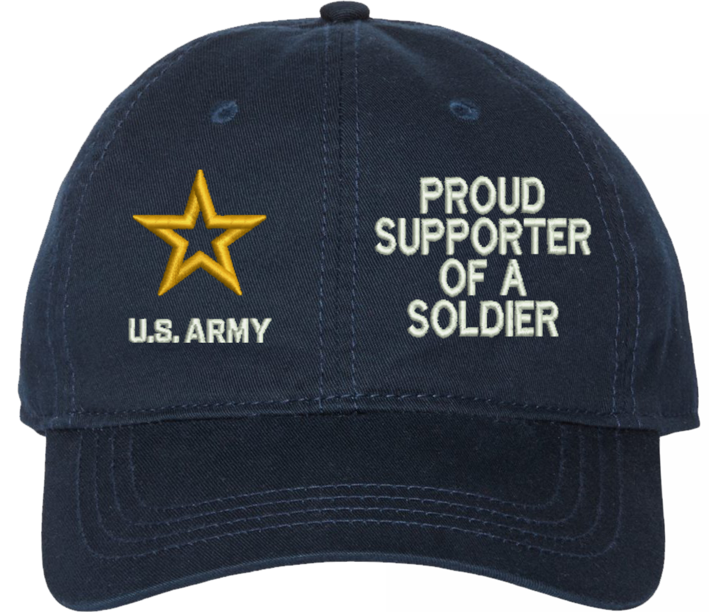 Show your Army pride with this Proud Supporter of a Soldier U.S. Army Unstructured Dad Cap from MilitaryBest. Crafted from 100% washed chino twill cotton, this six-panel, low-profile cap offers a relaxed and comfortable fit. Featuring high-quality embroidery done in our Scottsboro, Alabama facility, this cap is designed with a pre-curved visor and an adjustable tri-glide buckle closure for a perfect fit. Whether for everyday wear or as a meaningful gift, this cap is a great way to honor your own or a loved one's service.For caps ordered with custom embroidered personalized text please allow an additional 3 to 5 days production time. All custom back text will be embroidered in ALL CAPITAL LETTERS. Caps with back text or eggs are non-returnable unless there is a material defect in the cap.
