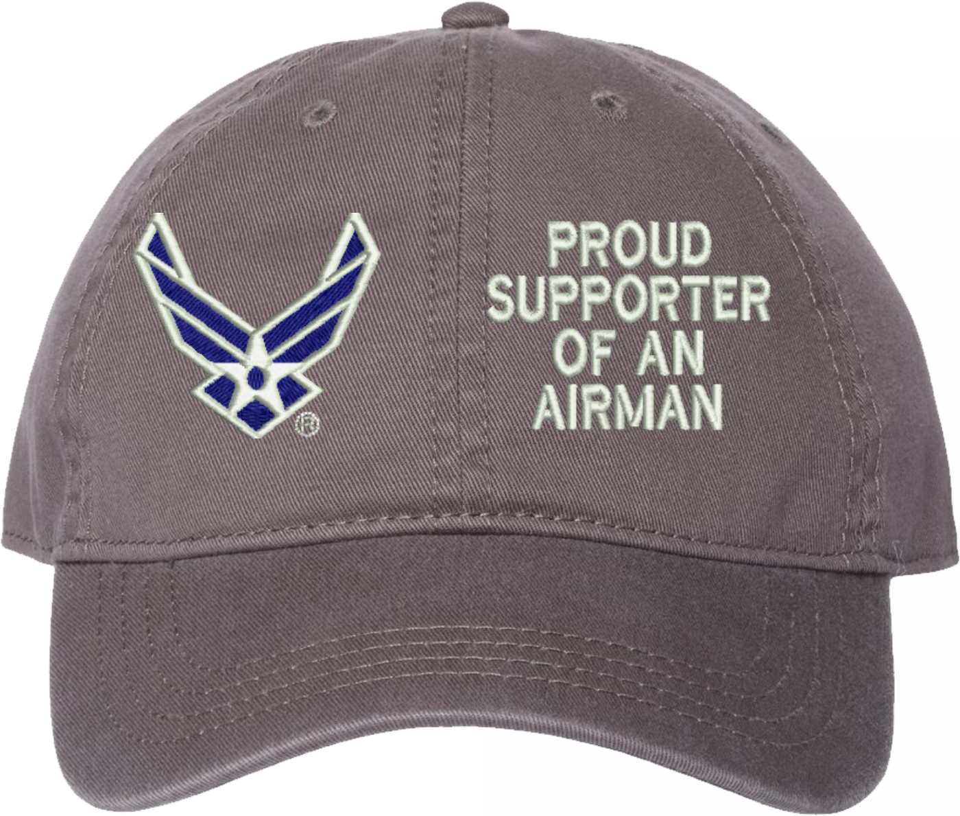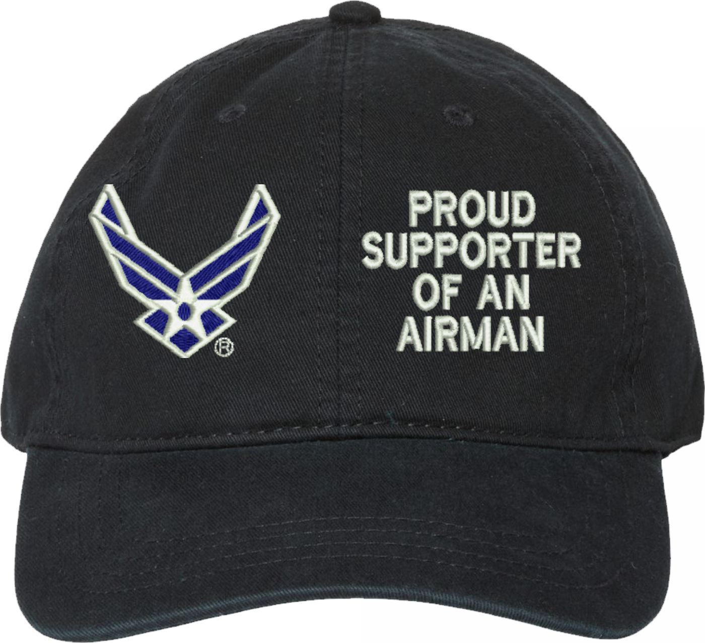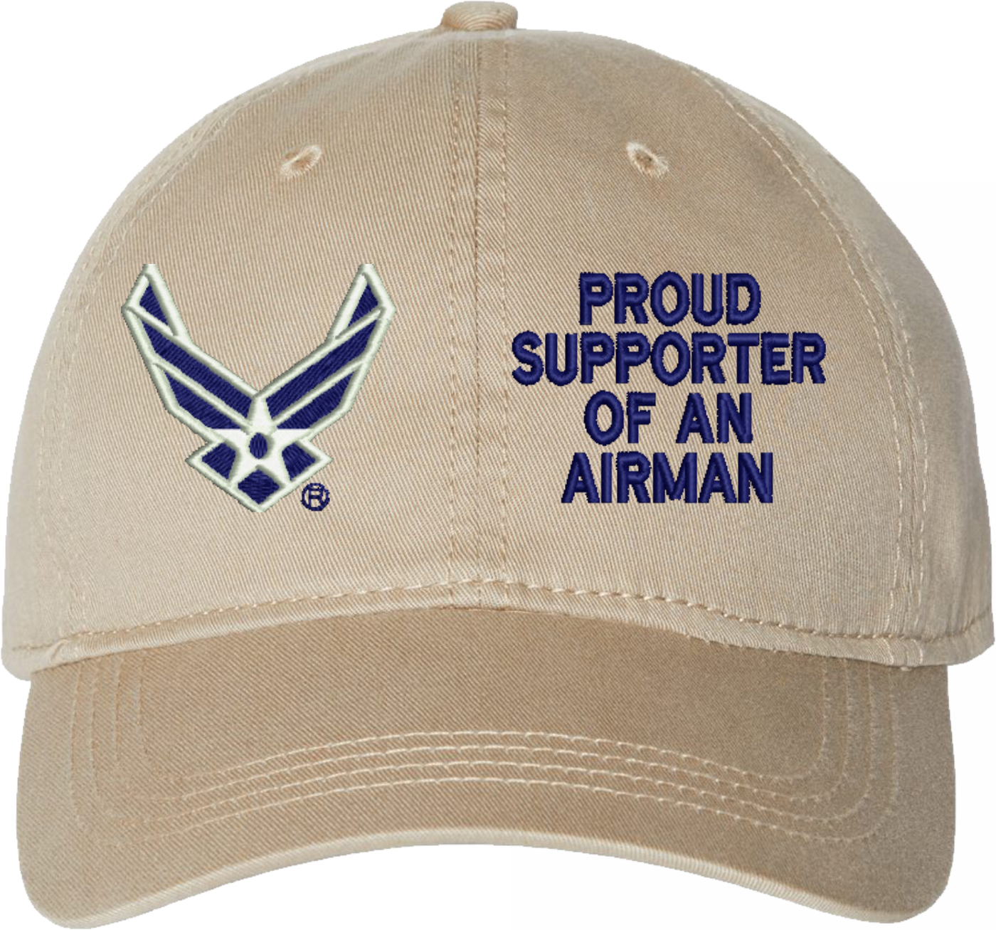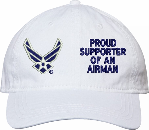 Show your Air Force pride with this Proud Supporter of an Airman U.S. Air Force Unstructured Dad Cap from MilitaryBest. Crafted from 100% washed chino twill cotton, this six-panel, low-profile cap offers a relaxed and comfortable fit. Featuring high-quality embroidery done in our Scottsboro, Alabama facility, this cap is designed with a pre-curved visor and an adjustable tri-glide buckle closure for a perfect fit. Whether for everyday wear or as a meaningful gift, this cap is a great way to honor your own or a loved one's service.For caps ordered with custom embroidered personalized text please allow an additional 3 to 5 days production time. All custom back text will be embroidered in ALL CAPITAL LETTERS. Caps with back text or eggs are non-returnable unless there is a material defect in the cap.