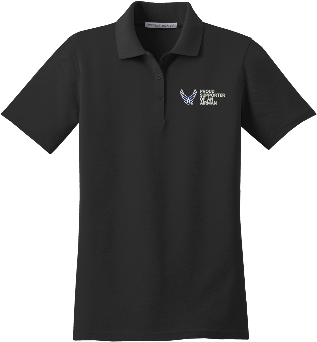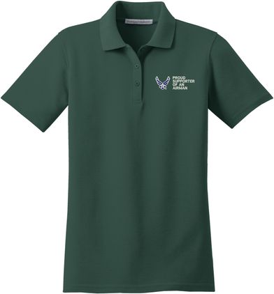 MilitaryBest is proud to offer this Proud Supporter of an Airman U.S. Air Force Women's Stain-Release Polo. This polo is embroidered by our MilitaryBest team in Northeast Alabama. These polos are made with a stain-release finish for long-lasting wear, odor-fighting properties, and superior wrinkle and shrink resistance.Care Instructions: Machine Wash Cold With Like Colors. Do Not Use Fabric Softener. Do Not Bleach. Tumble Dry Low. Warm Iron If Necessary.