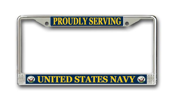 This 'Proudly Serving' United States Navy Plate Frame is made from the highest quality finished metal alloy. Each one is designed to provide years of use. Each is designed in our facility in Scottsboro, Alabama.Our Military License Plate Frames are standard designs and have been a staple in our product line for 15 years. Please check with your state and local regulations regarding suitability for displaying this License Plate Frame on you vehicle since these regulations may have changed over time.