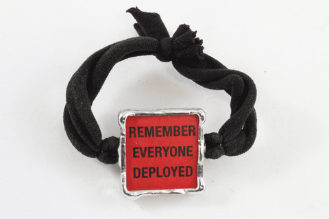 MilitaryBest is proud to have partnered with Amy Catherine Designs to offer this Remember Everyone Deployed Elastic Wristband. This wrist band is double sided with a front and back charm and is attached to a stretchable band. Each wristband is made in the USA and its quality is guaranteed.