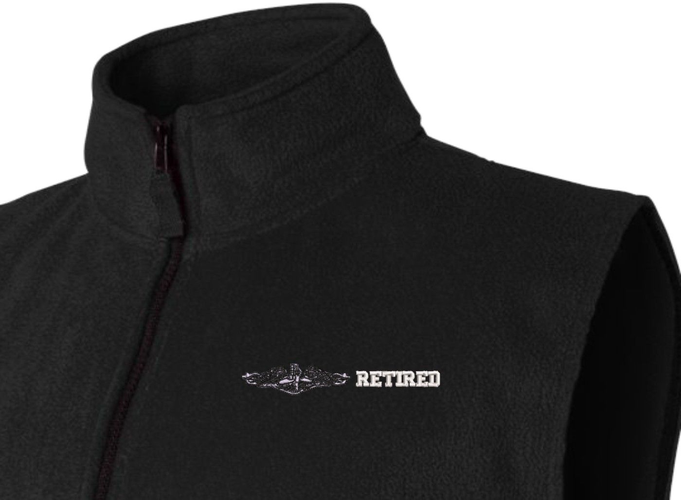 Due to supply chain disruptions, some colors and sizes may not be available in the same Brand, in these cases a brand of comparable quality will be used. Feel free to call in advance of your order, with questions you may have.MilitaryBest is proud to offer this quality U.S. Navy Enlisted Silver Dolphins Retired Full Zip Fleece Vest. Our U.S. Navy Full Zip Fleece Vest features a convertible collar with dyed-to-match zipper pull and oversized nylon reinforced slash pockets. These Military Vests are proudly embroidered at our facilities in Scottsboro, AL.