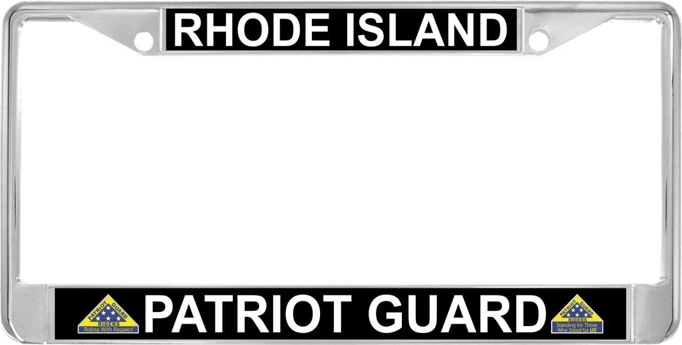 This Rhode Island Patriot Guard Automobile License Plate Frame is proudly produced at our facility in Scottsboro, Alabama. Each Chrome Dipped Alloy Frame has Poly Coated Aluminum Inserts which allow our production team to provide you with High Quality Designs. Unfortunately, this frame is not offered as a Motorcycle Frame.Please check with your state and local regulations regarding suitability for displaying this Automobile License Plate Frame on your vehicle since these regulations may have changed in your state. Various weather and road conditions may impact the life span of your frame e.g. salted roads, long exposure to direct sunlight etc.