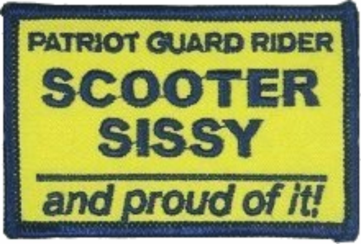 We are proud to offer this Patriot Guard Scooter Sissy Patch. This patch measures 3" wide x 2" tallIn the early days of the Patriot Guard Riders, the head of a "family based protest group" referred to the Patriot Guard Riders as "a bunch of scooter sissies". Many Patriot Guard Riders members now wear that title as a badge of honor