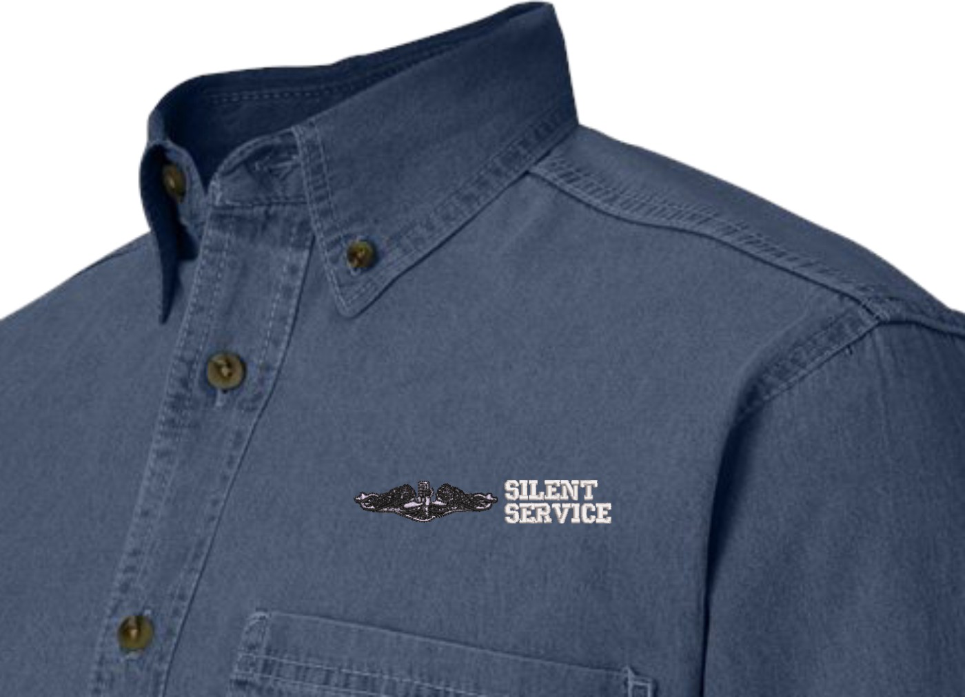 Note: Some of the Color Options pictured may not be available. Available Color Options are listed on the drop down menu above.MilitaryBest is proud to offer this quality U.S. Navy Enlisted Silver Dolphins Silent Service Denim Shirt. This long sleeve button down denim shirt is made using a 100% cotton denim material. These quality Military Denim Shirts are proudly embroidered at our facilities in Scottsboro, AL. Support the Navy MWR program by purchasing only from Licensed Vendors.